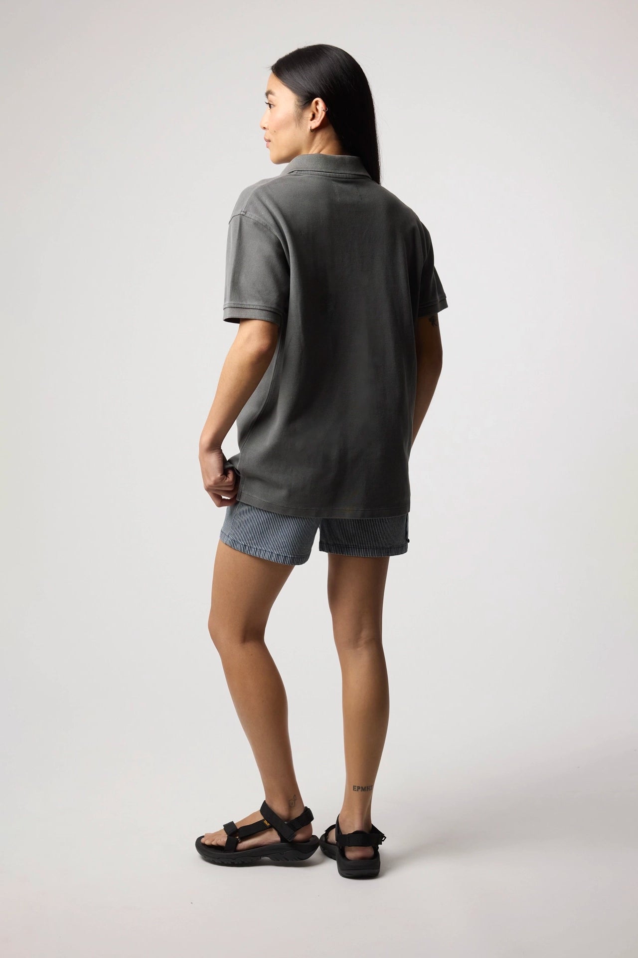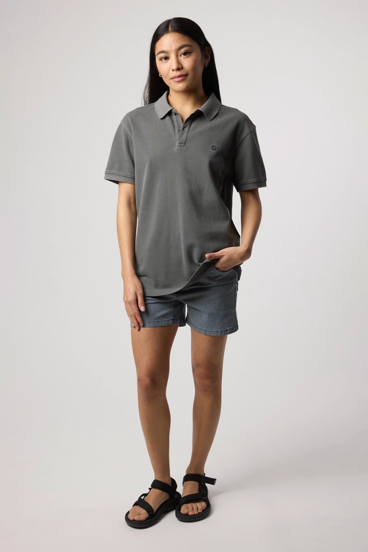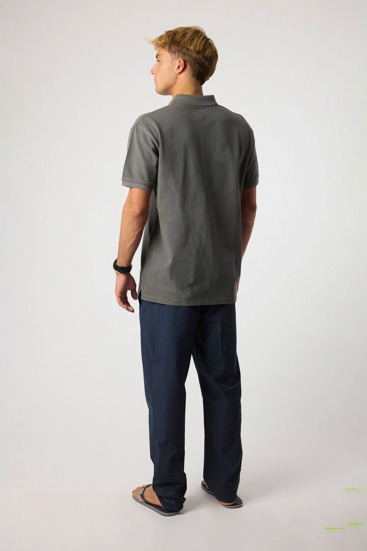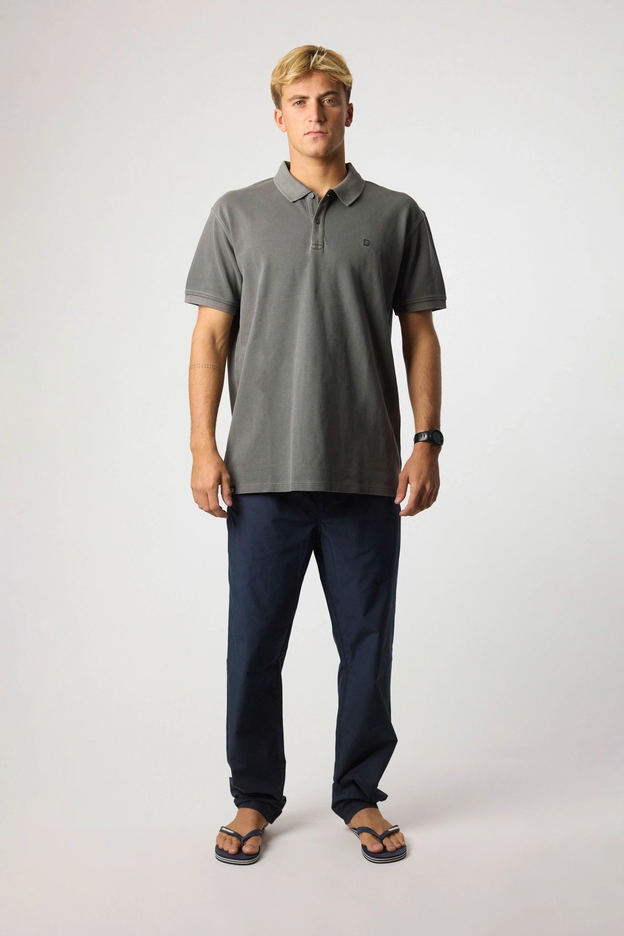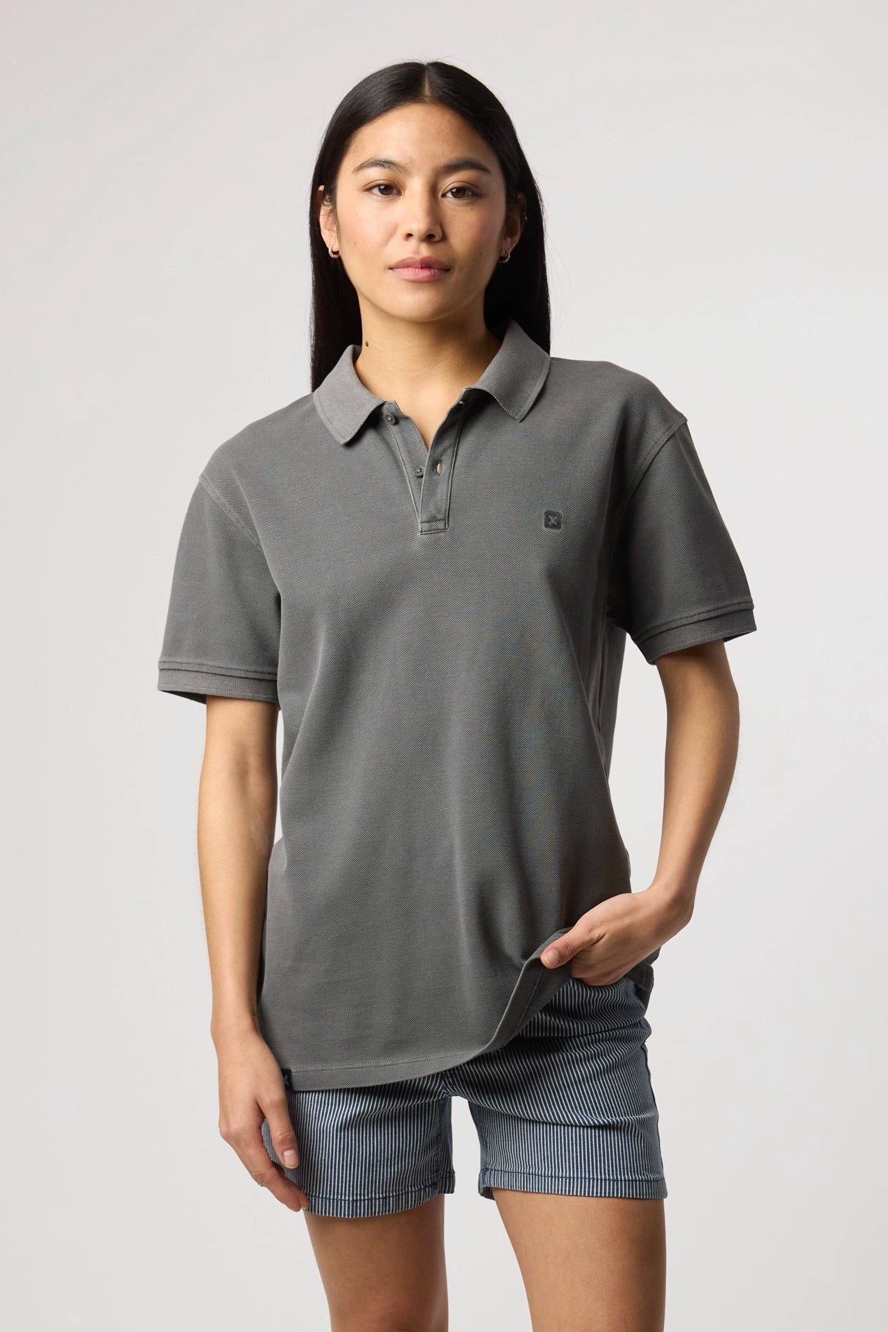 Washed effect polo shirt with logo on the chest in the form of a label. Collar with button closure. Made with 100% organic cotton and regular fit cut. Ribbed finishes on the sleeves.