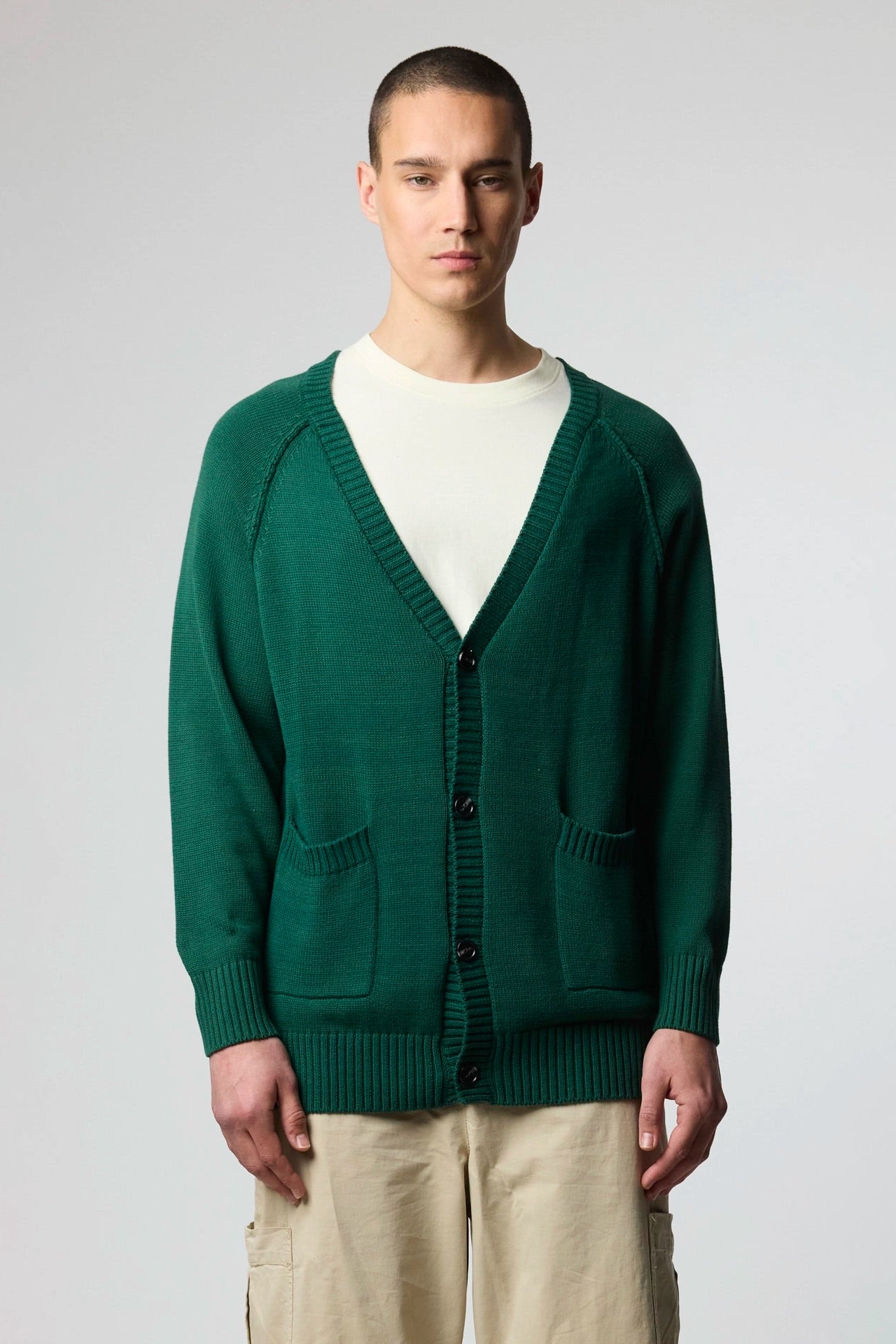 Relaxed fit cardigan made of lightweight cotton yarn. Side pockets on the front. V-neck and long raglan sleeves. Ribbed finishes. Front button closure. Decorative label at the bottom.