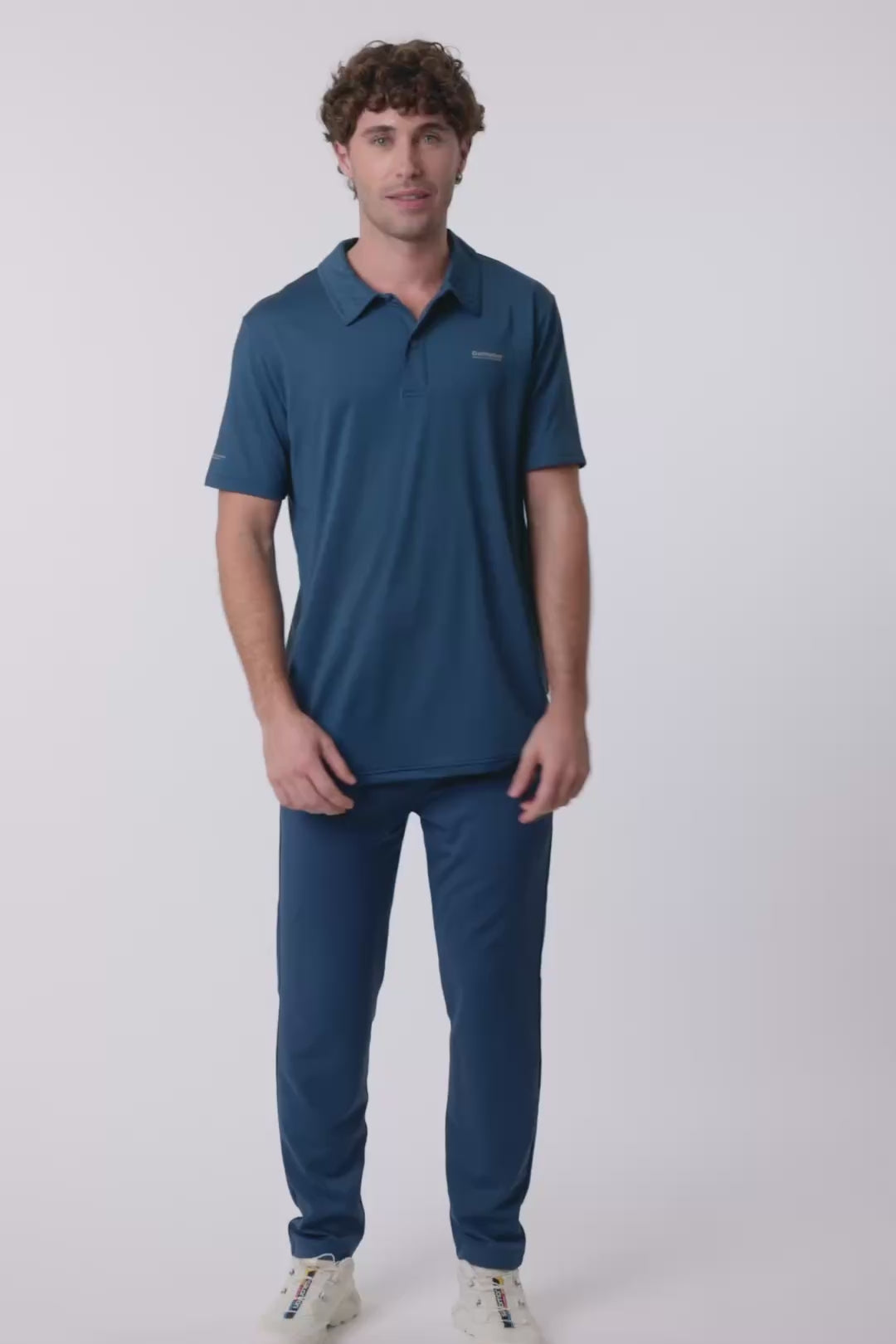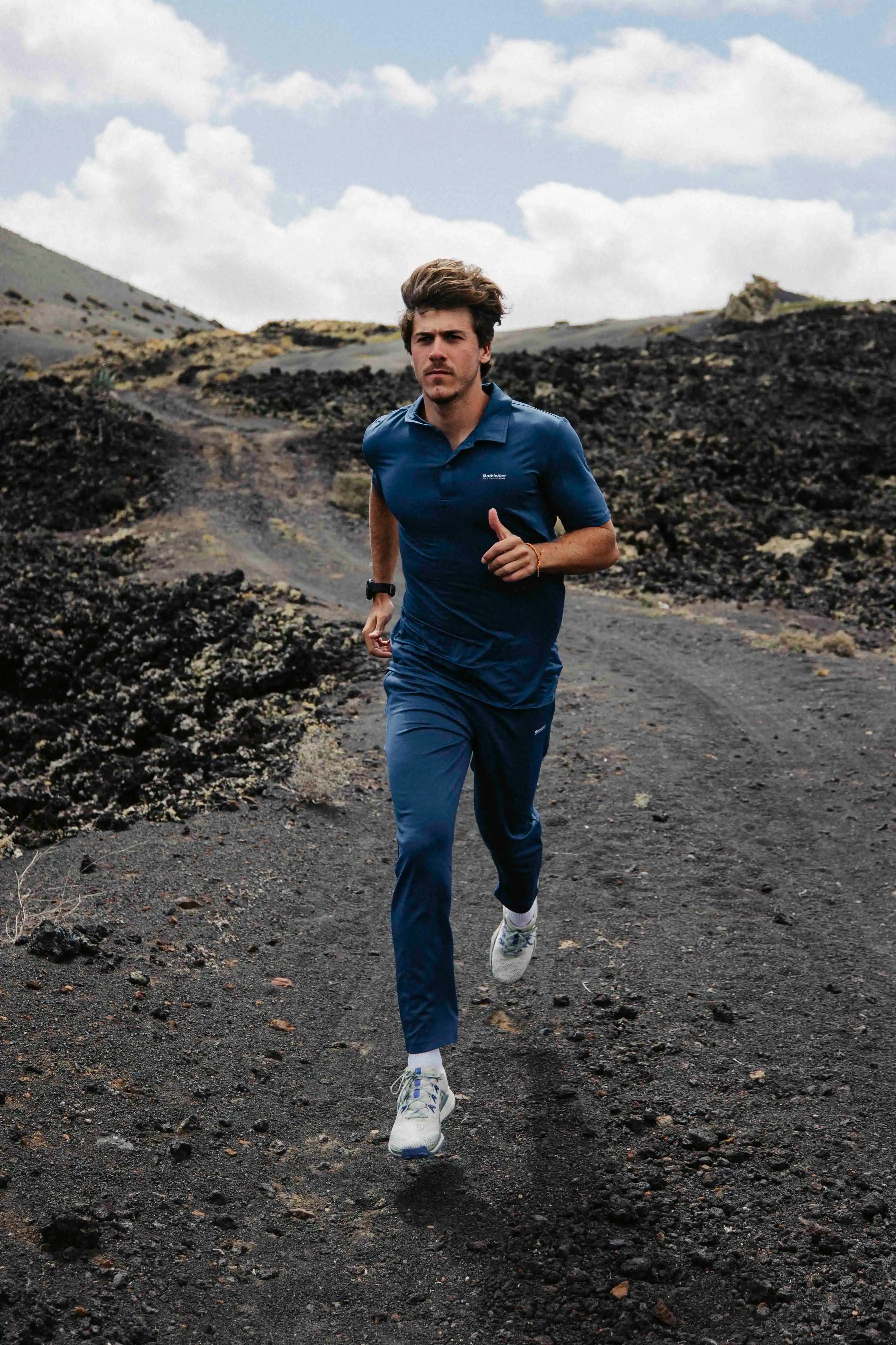 Long sports pants made of polyester, quick-drying and upf 50+. Elastic waist with drawstring closure. Front side pockets. Reflective logo on the front upper left and lower back left.
