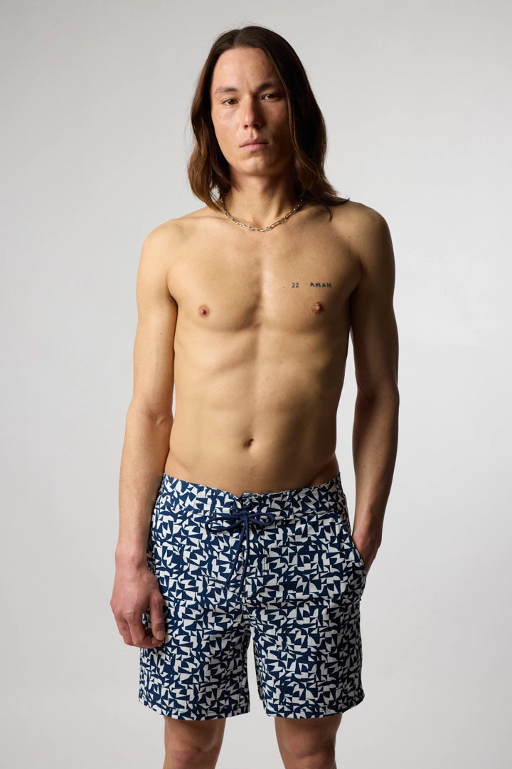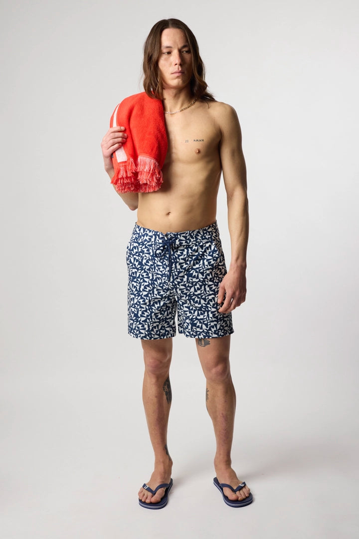 Printed surf swim trunks. Fixed waist, drawstring closure, and embroidered patch on the lower right side. Back pocket on the upper right side.