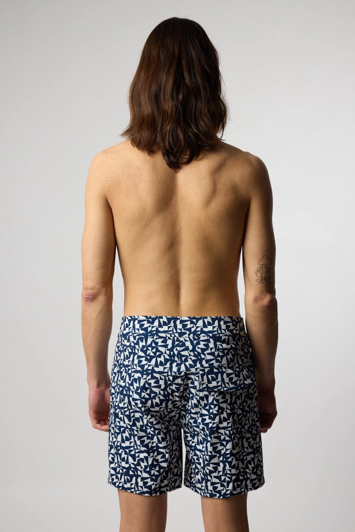 Printed surf trunks with a fixed waist, drawstring, and back pocket.