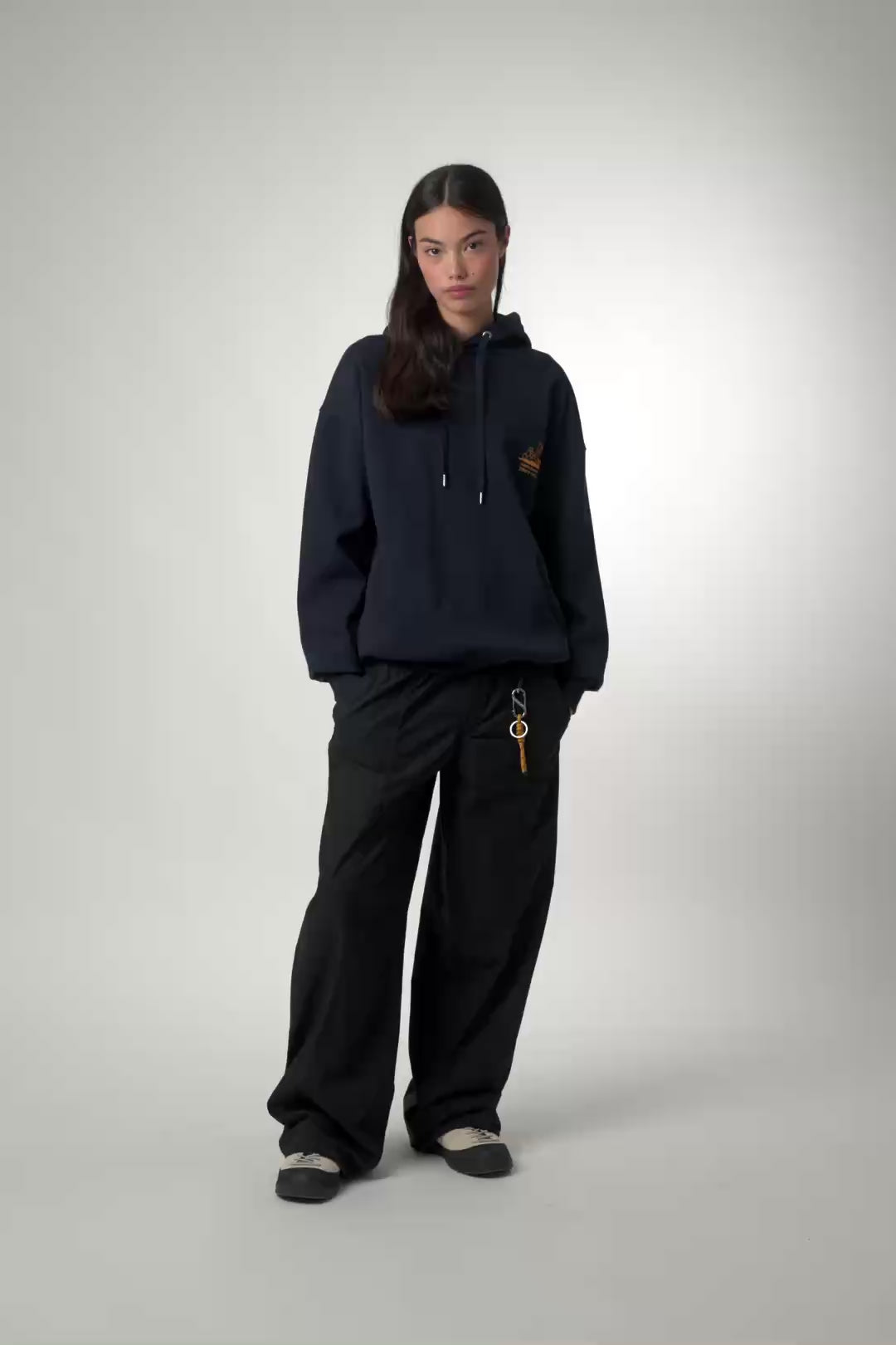 Hoodie with front print on upper left side and central back print. Lower front pocket with openings on both sides. Made from 100% organic cotton, oversize fit.
