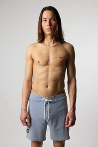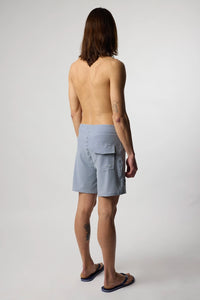 Swim shorts with a straight cut. Fixed waistband with drawstring closure. Front side pockets and a lateral pocket on the upper right side.
