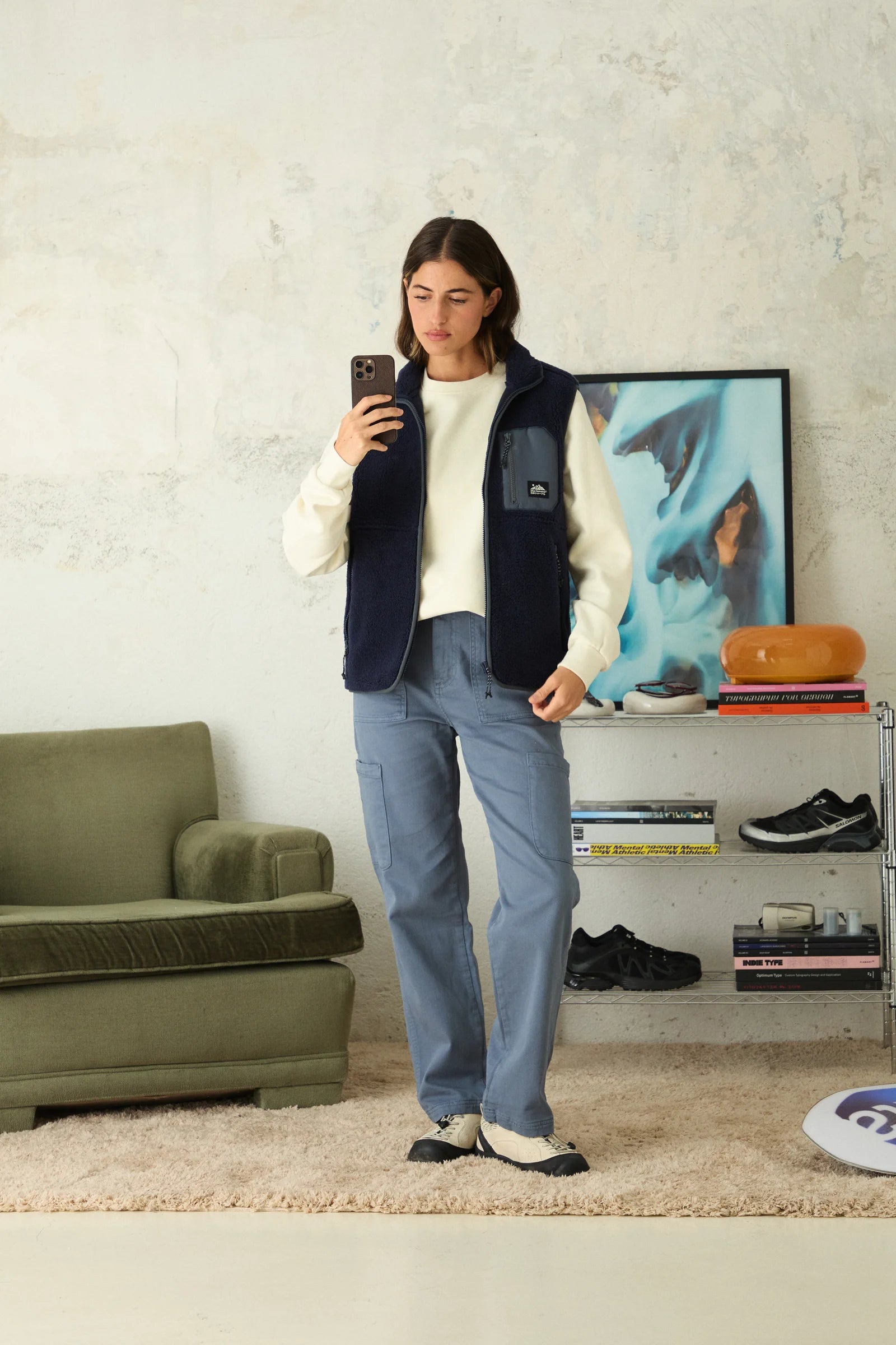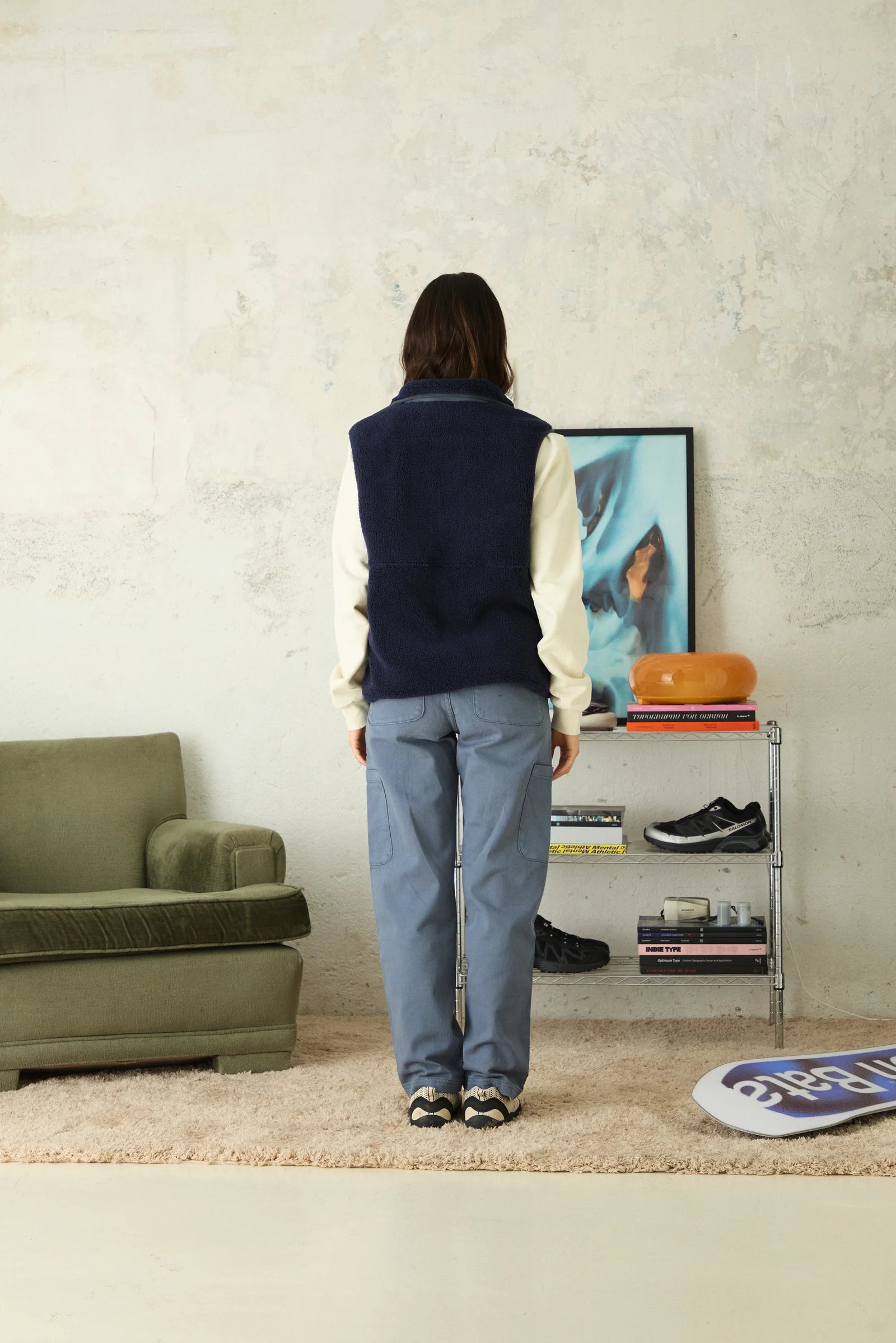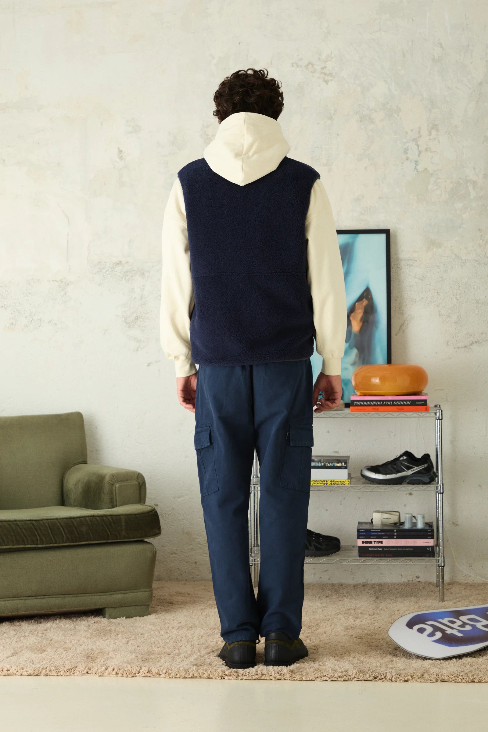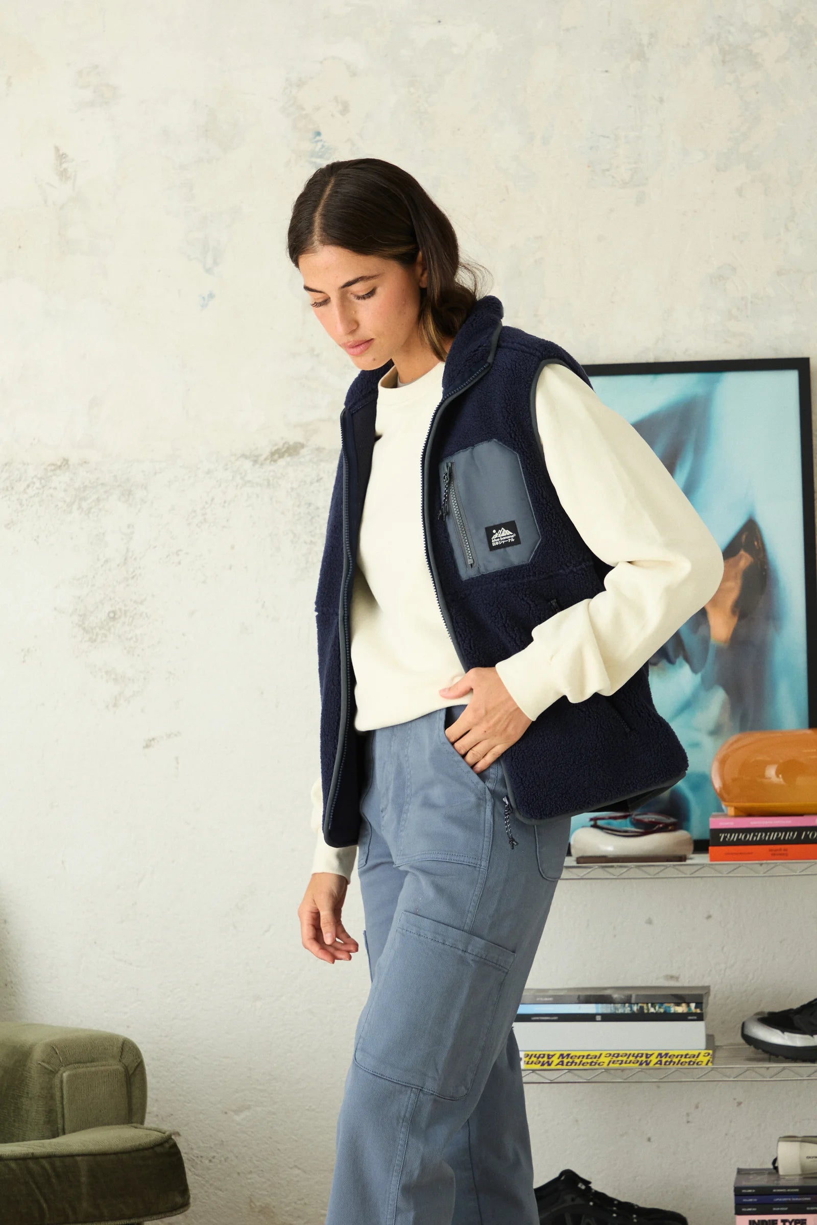 Polyester and sherpa vest, warm, versatile, and with functional pockets.