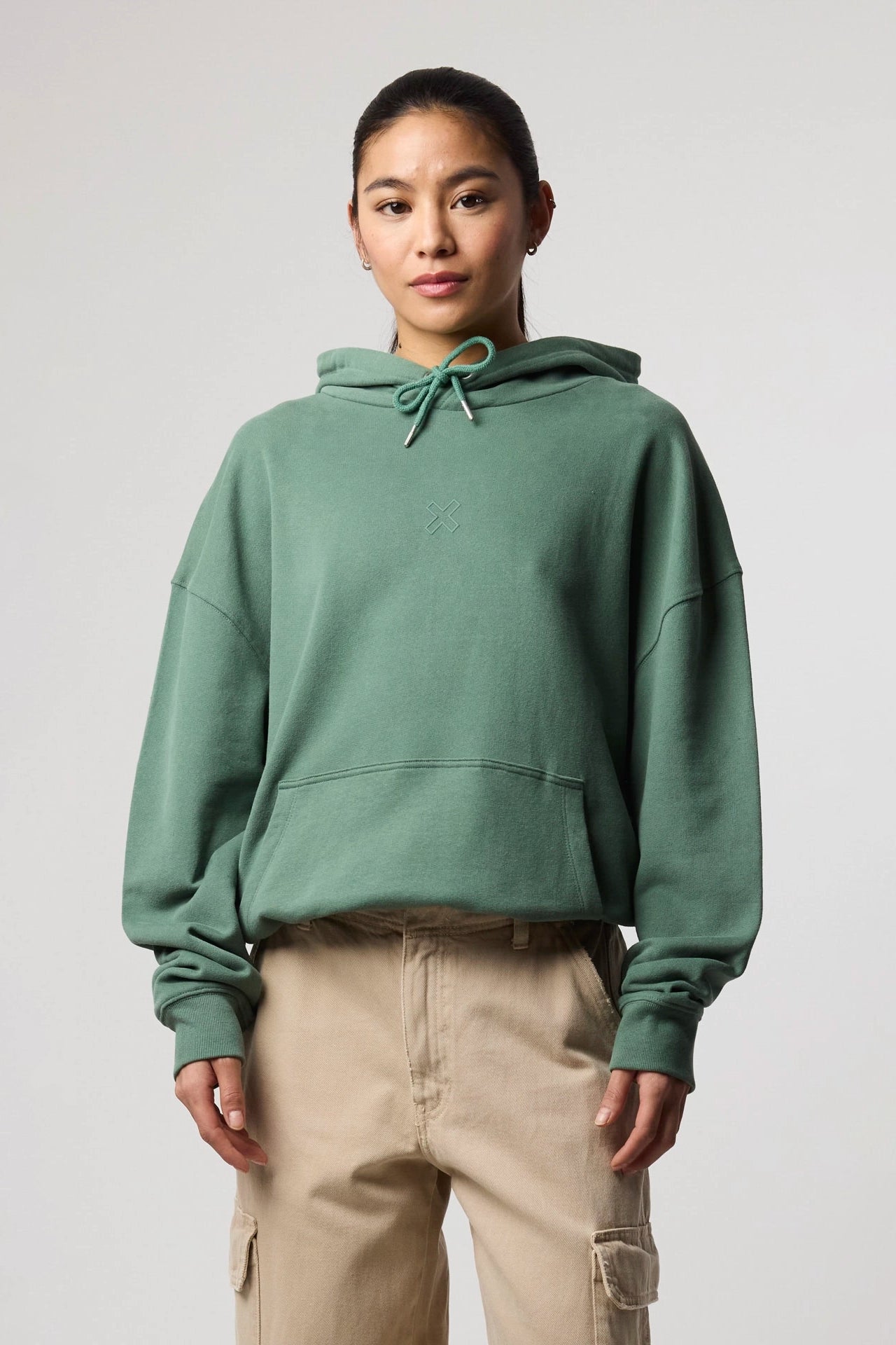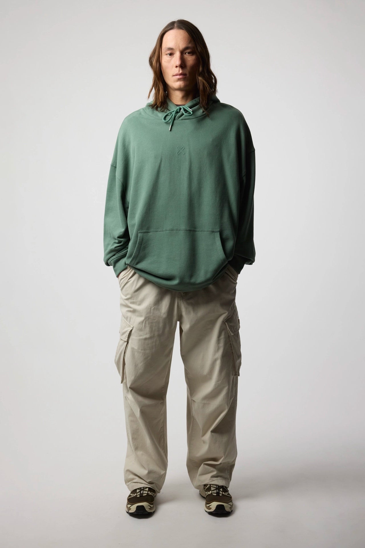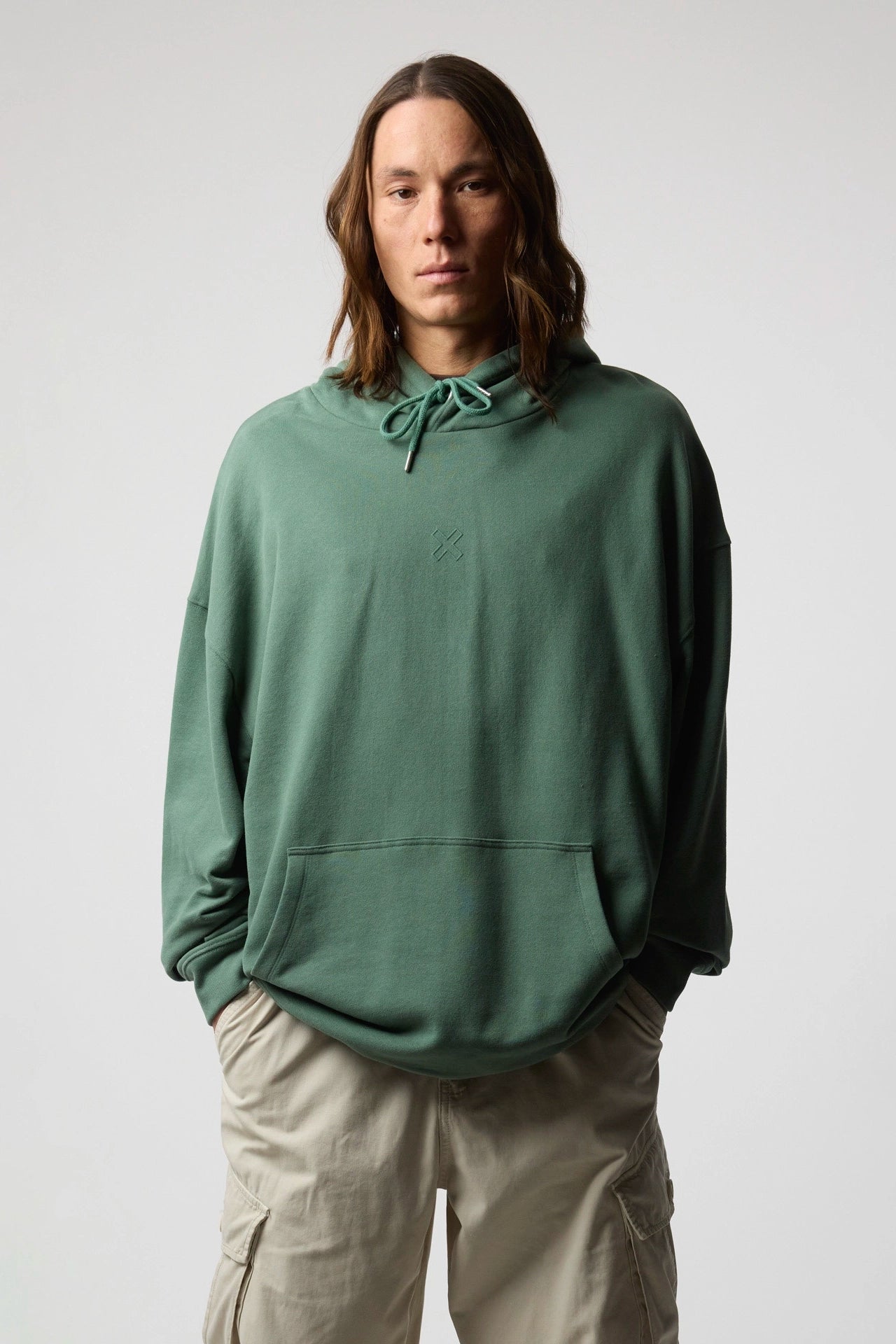 Hoodie with front and back print. Made with 100% organic cotton and with a pocket in the central front part. Not brushed for a more summery result. Oversize cut.