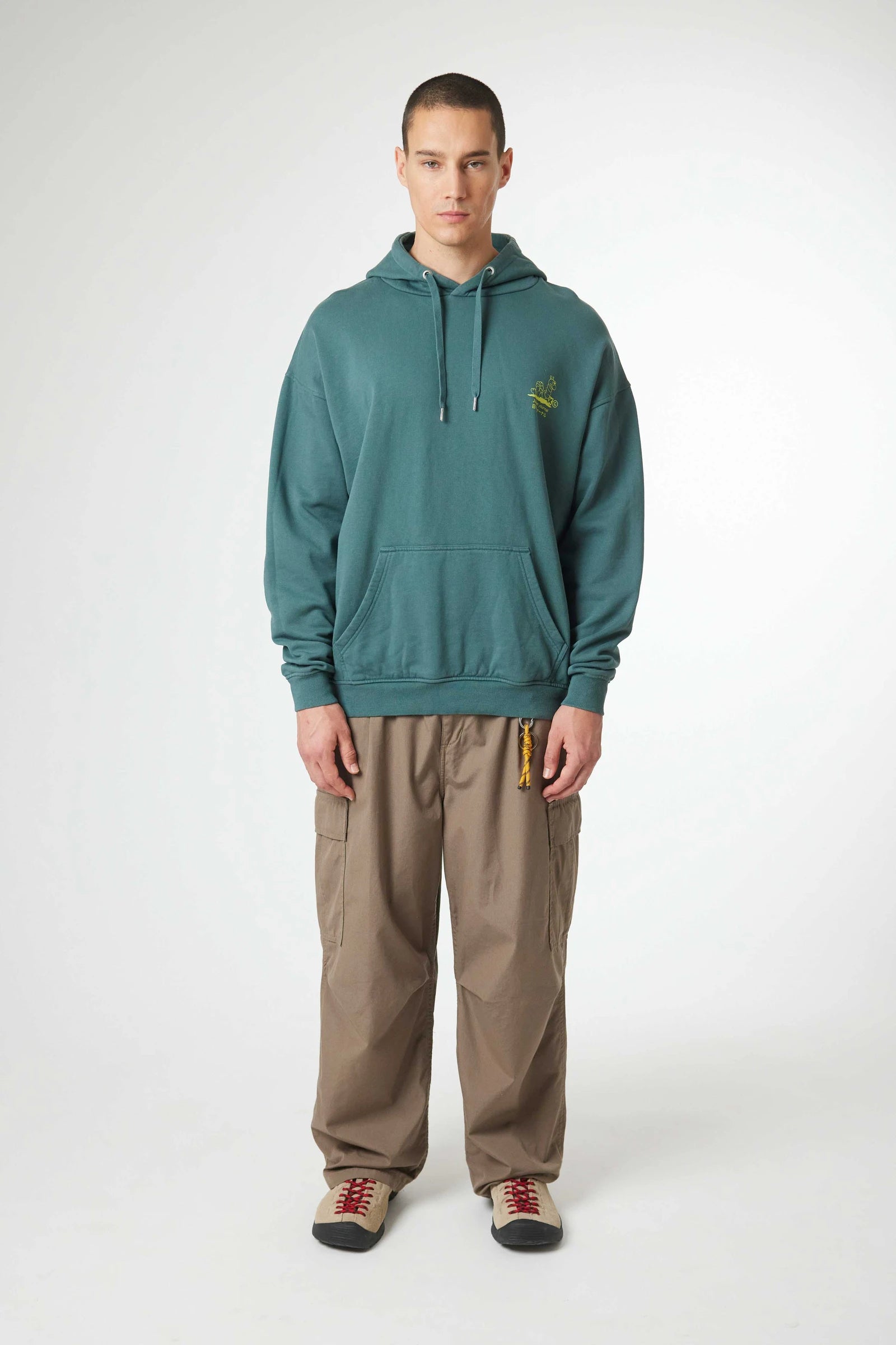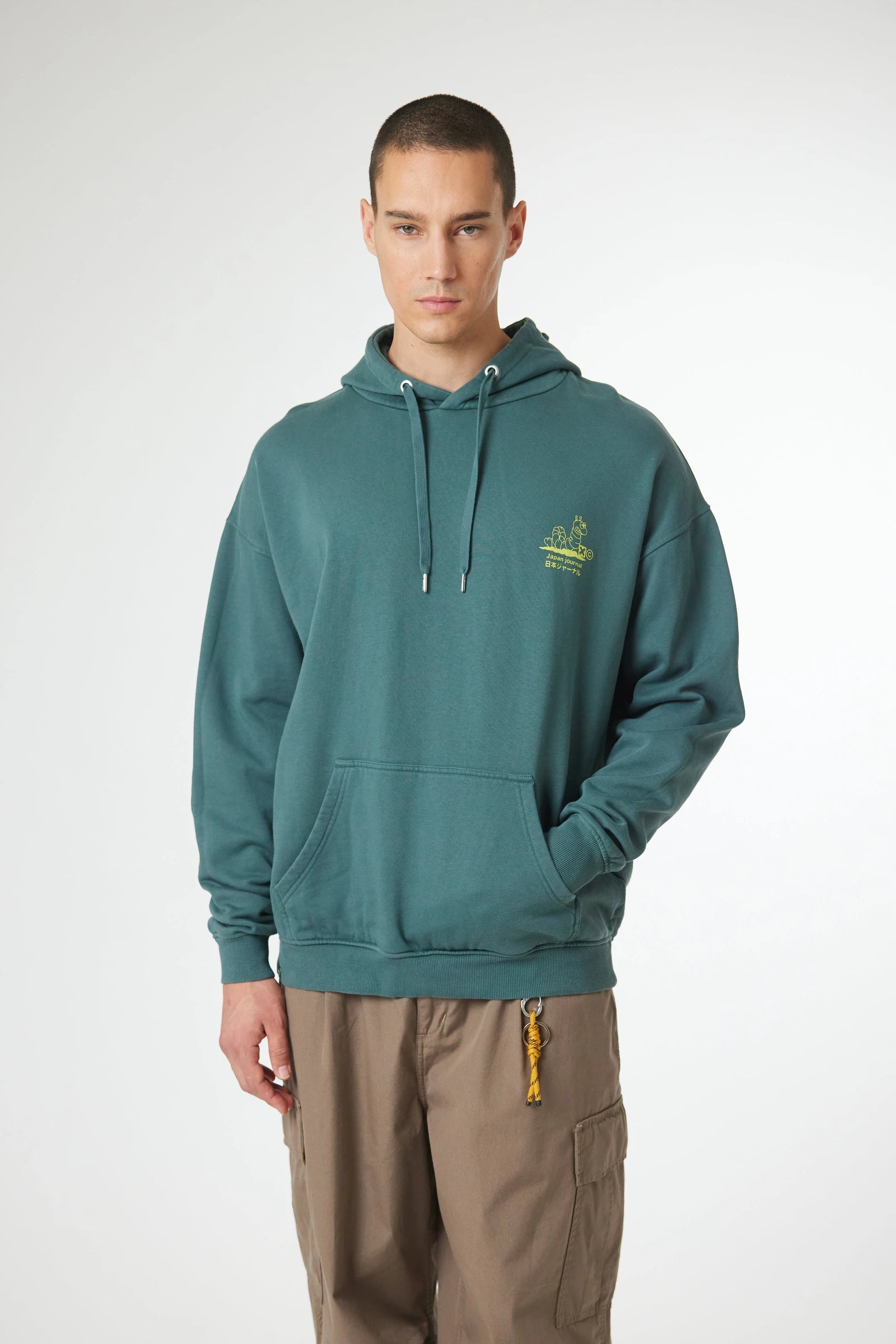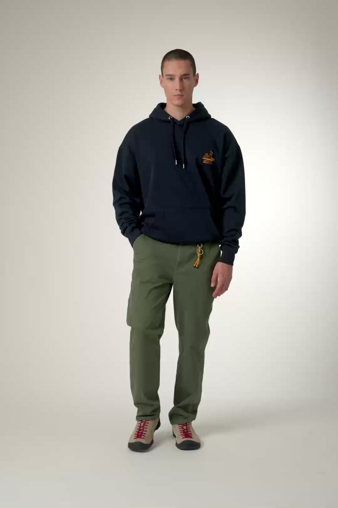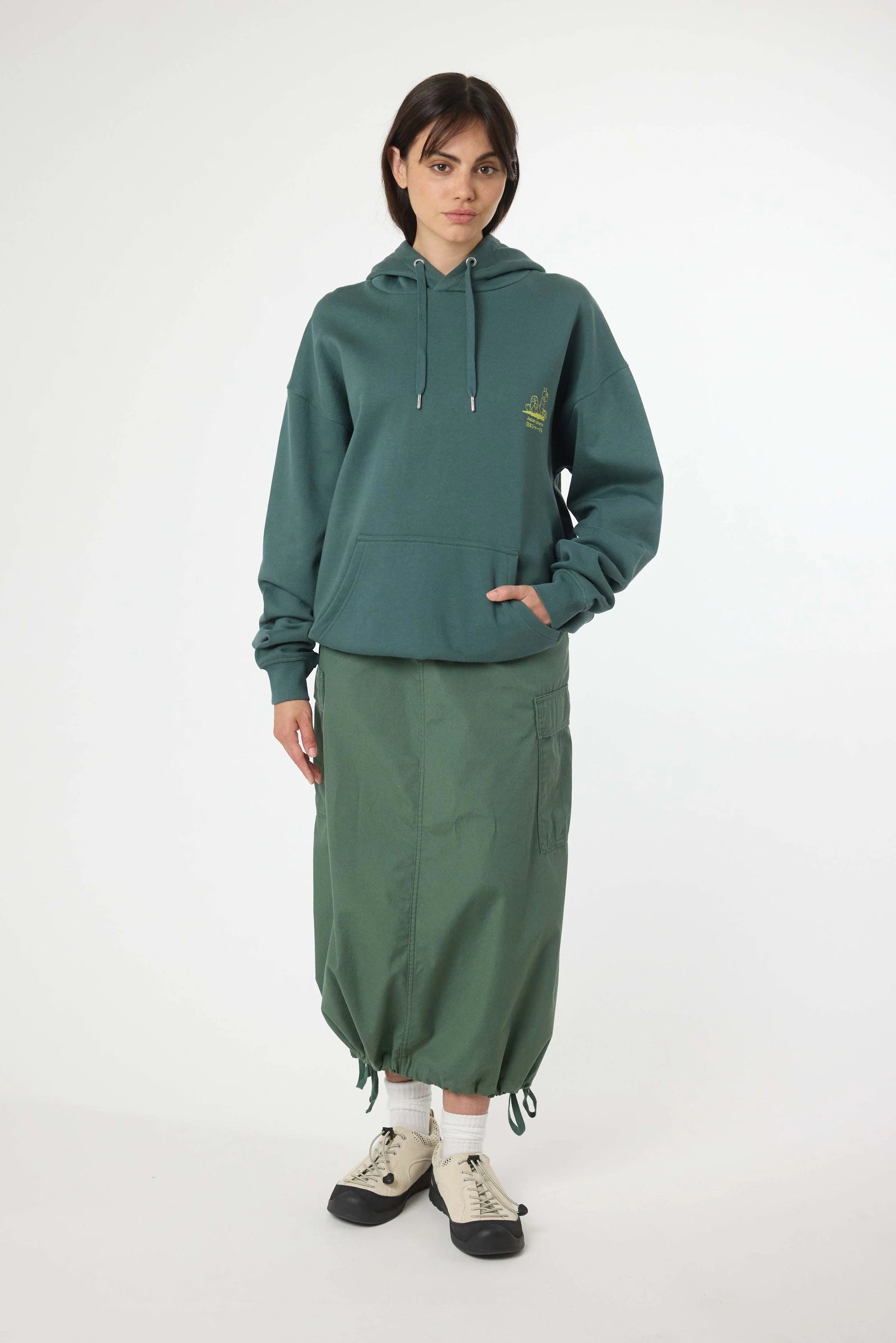 Hoodie with front print on upper left side and central back print. Lower front pocket with openings on both sides. Made from 100% organic cotton, oversize fit.