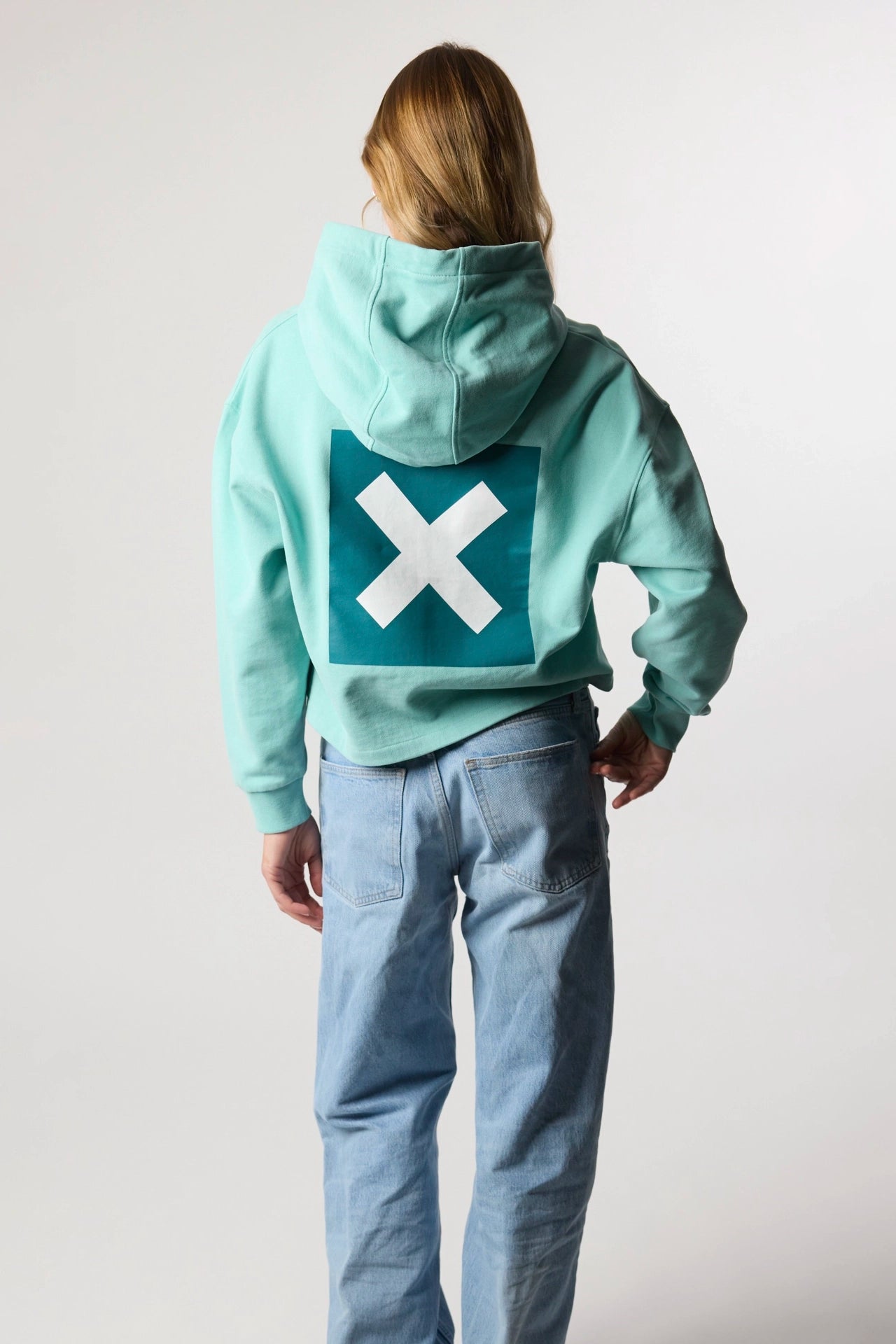 Felpa con cappuccio e la nostra caratteristica X sul davanti e sul retro. Realizzata in 100% cotone biologico e con una vestibilità corta. Non garzata per un look più estivo.