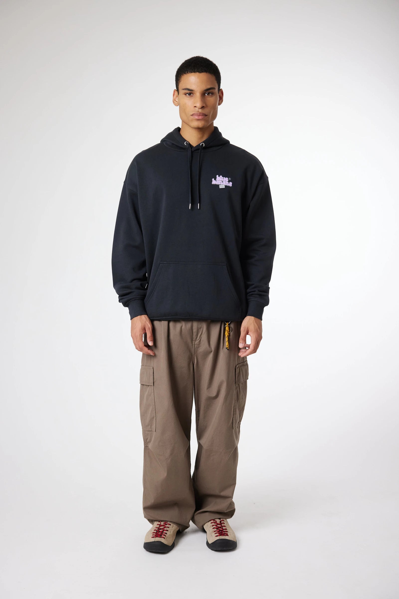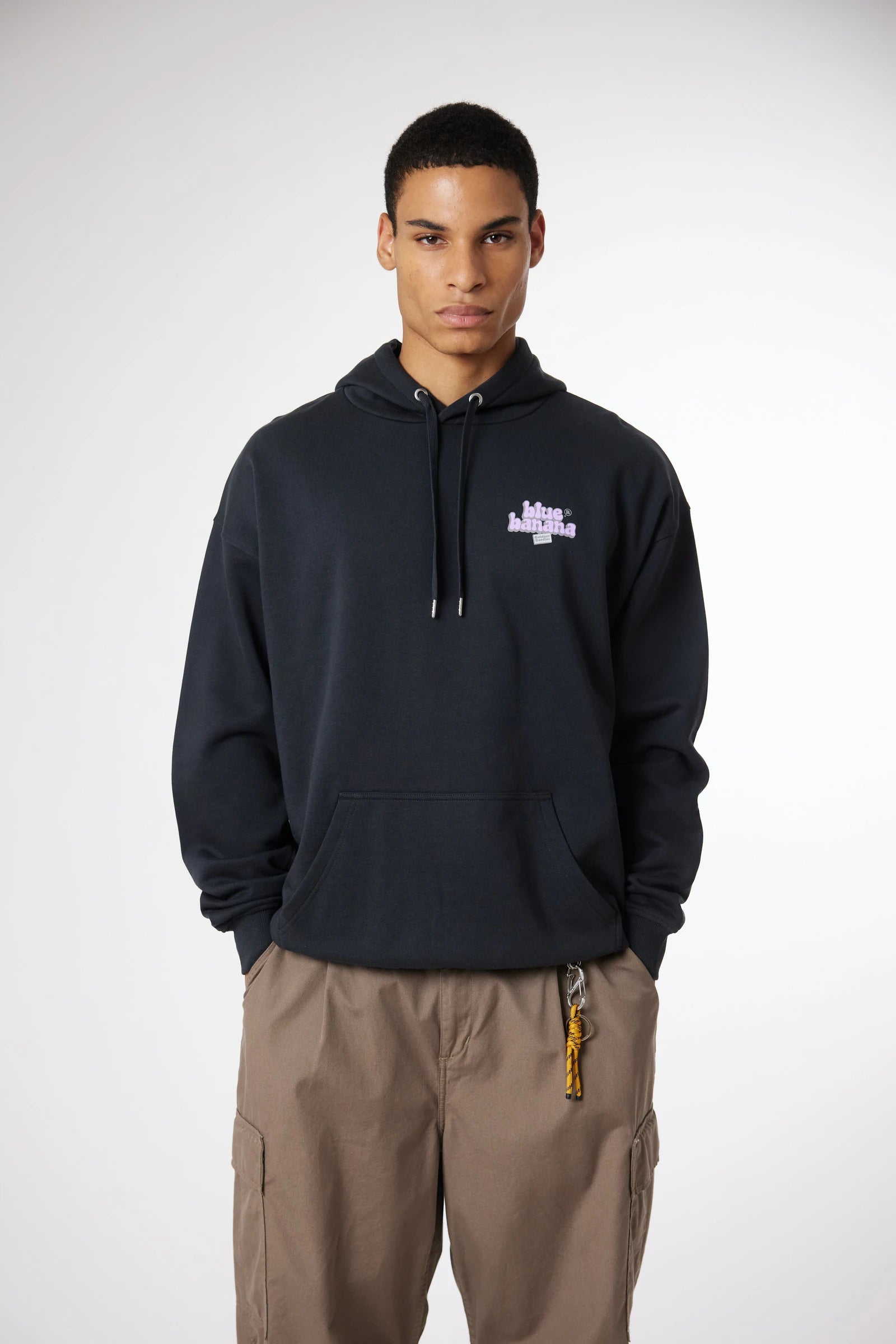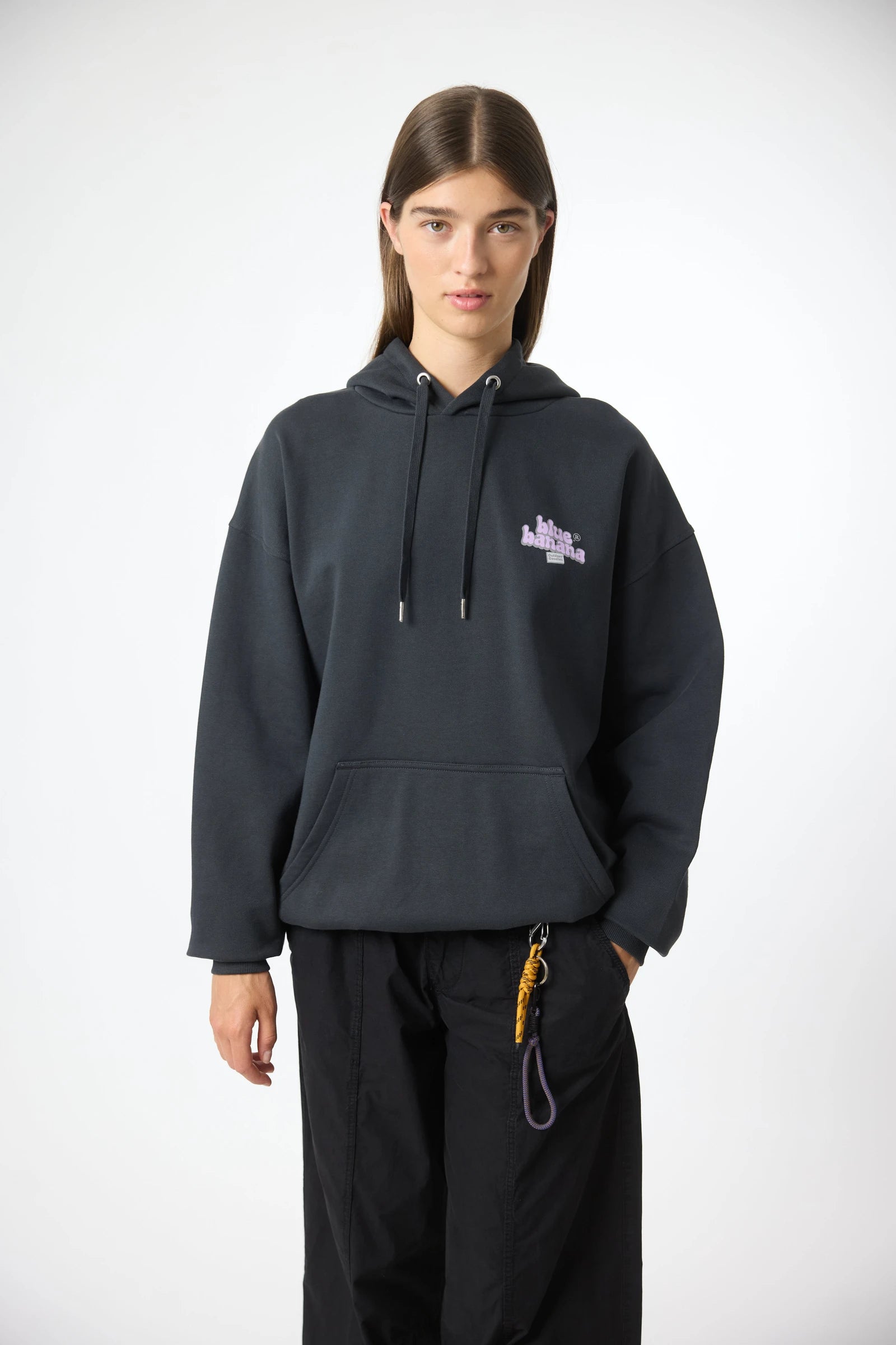 Felpa con cappuccio con stampa frontale in alto a sinistra e stampa centrale sul retro. Tasca anteriore centrale inferiore con aperture su entrambi i lati. Realizzata in 100% cotone biologico e dalla vestibilità oversize.