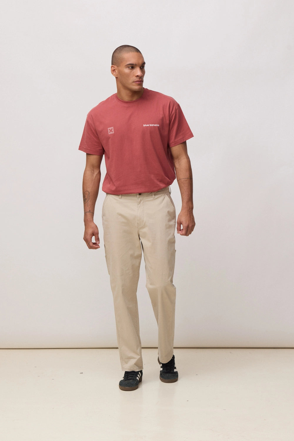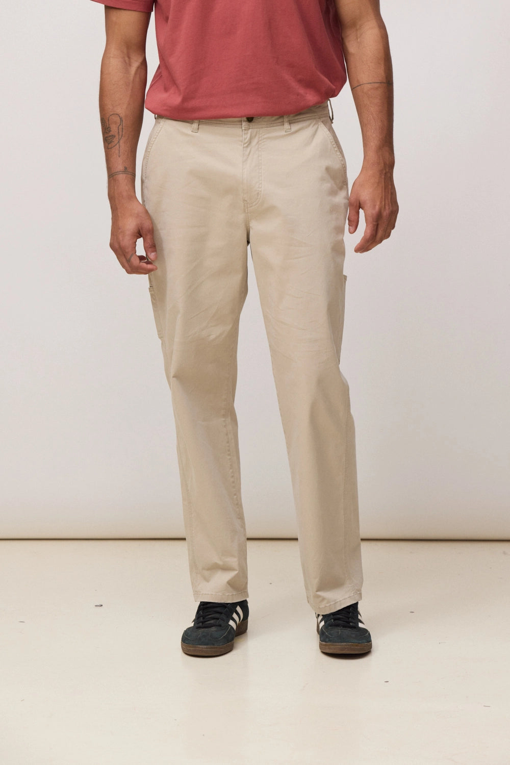 Pantalón largo de corte recto (straight fit). Abertura de cremallera y botón personalizado. Bolsillos diagonales en delantero. Bolsillos traseros con etiqueta decorativa. Detalles de bolsillo estilo "carpenter" en pierna. Etiqueta tejida en la parte trasera. Confeccionado con 97% algodón orgánico y 3% elastano.