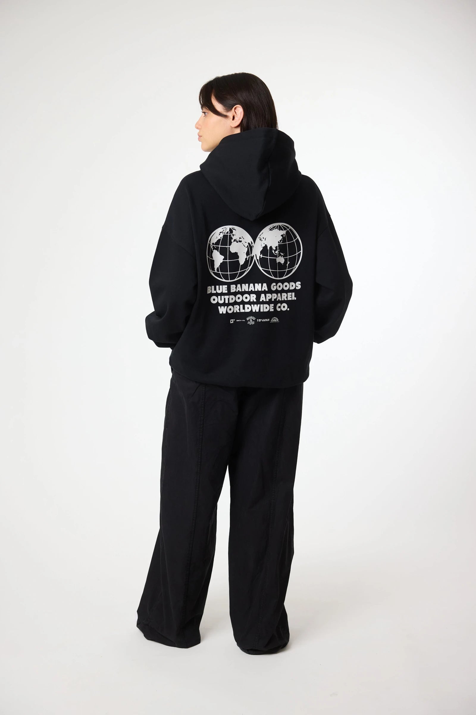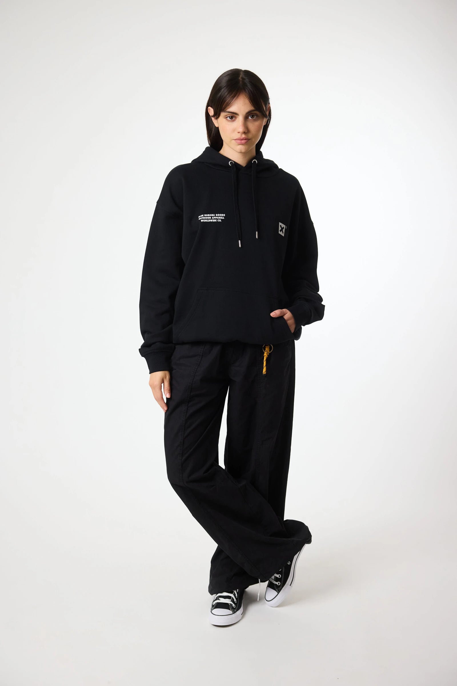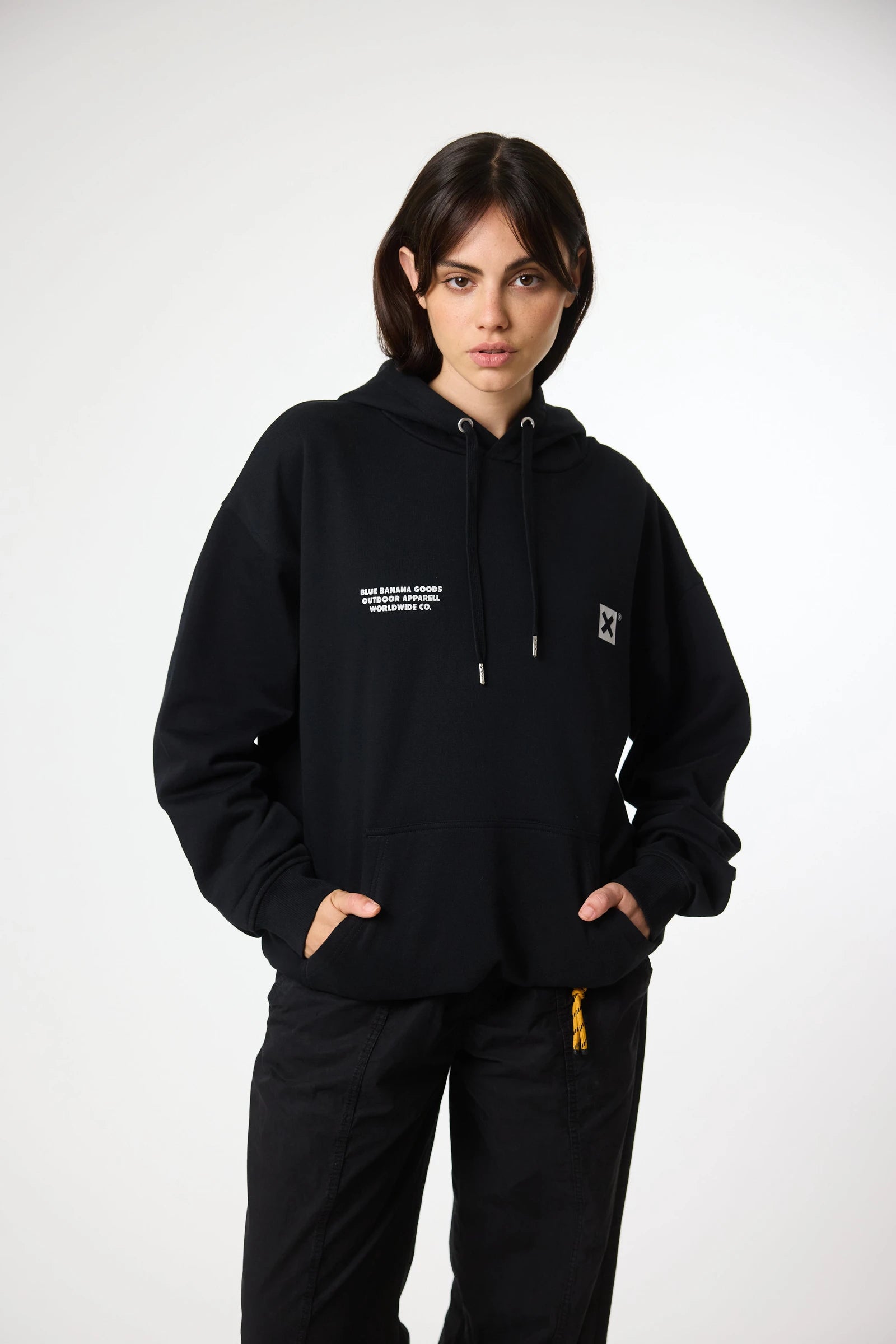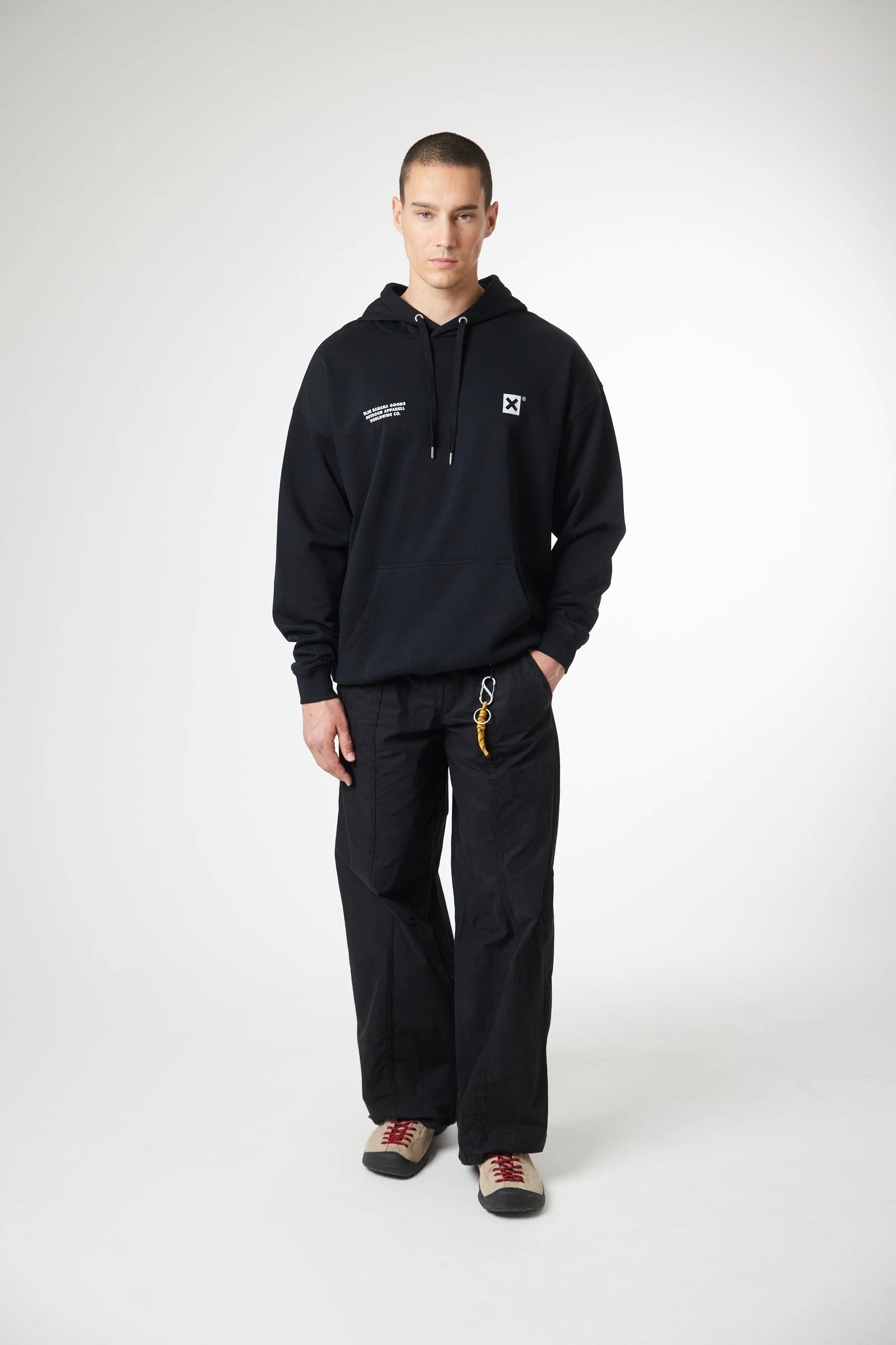 Felpa con cappuccio con stampa frontale in alto a sinistra e stampa centrale sul retro. Tasca anteriore centrale inferiore con aperture su entrambi i lati. Realizzata in 100% cotone biologico e dalla vestibilità oversize.