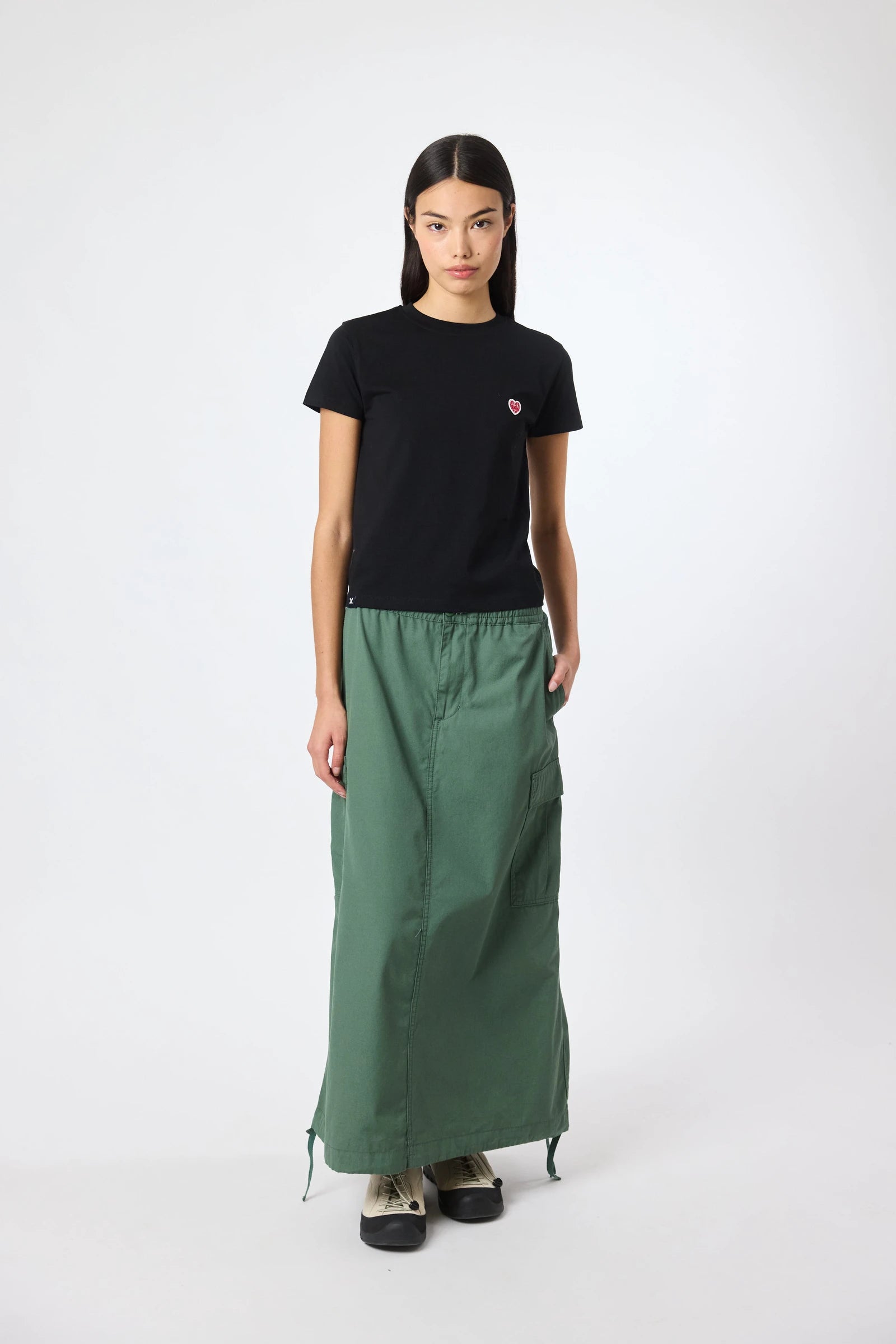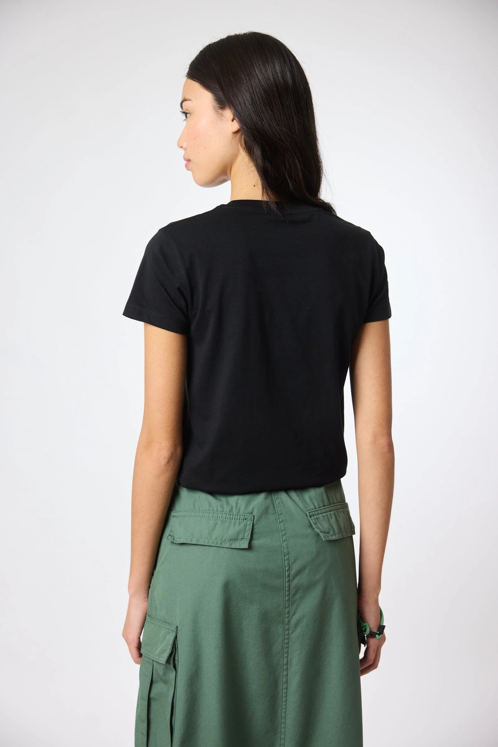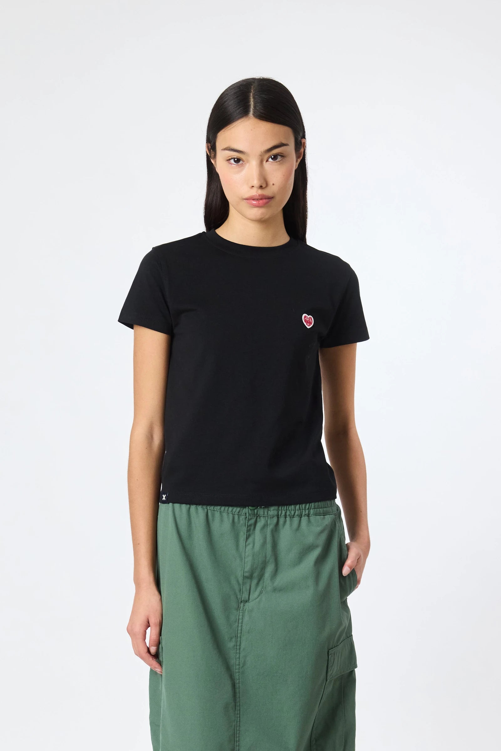 T-shirt a maniche corte con patch decorativo sul petto. Realizzata in cotone 100% organico e vestibilità crop.