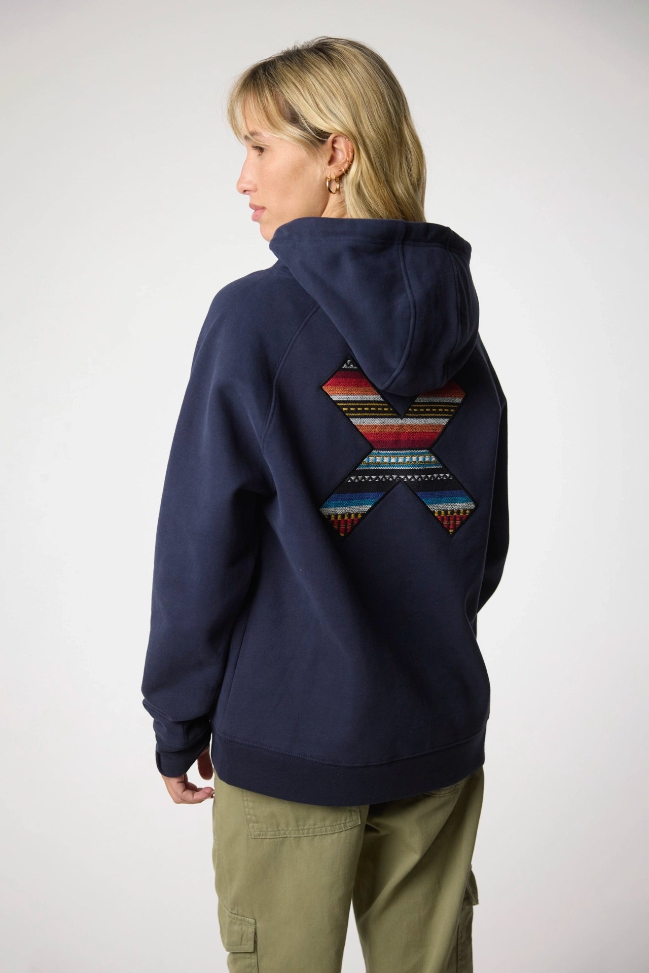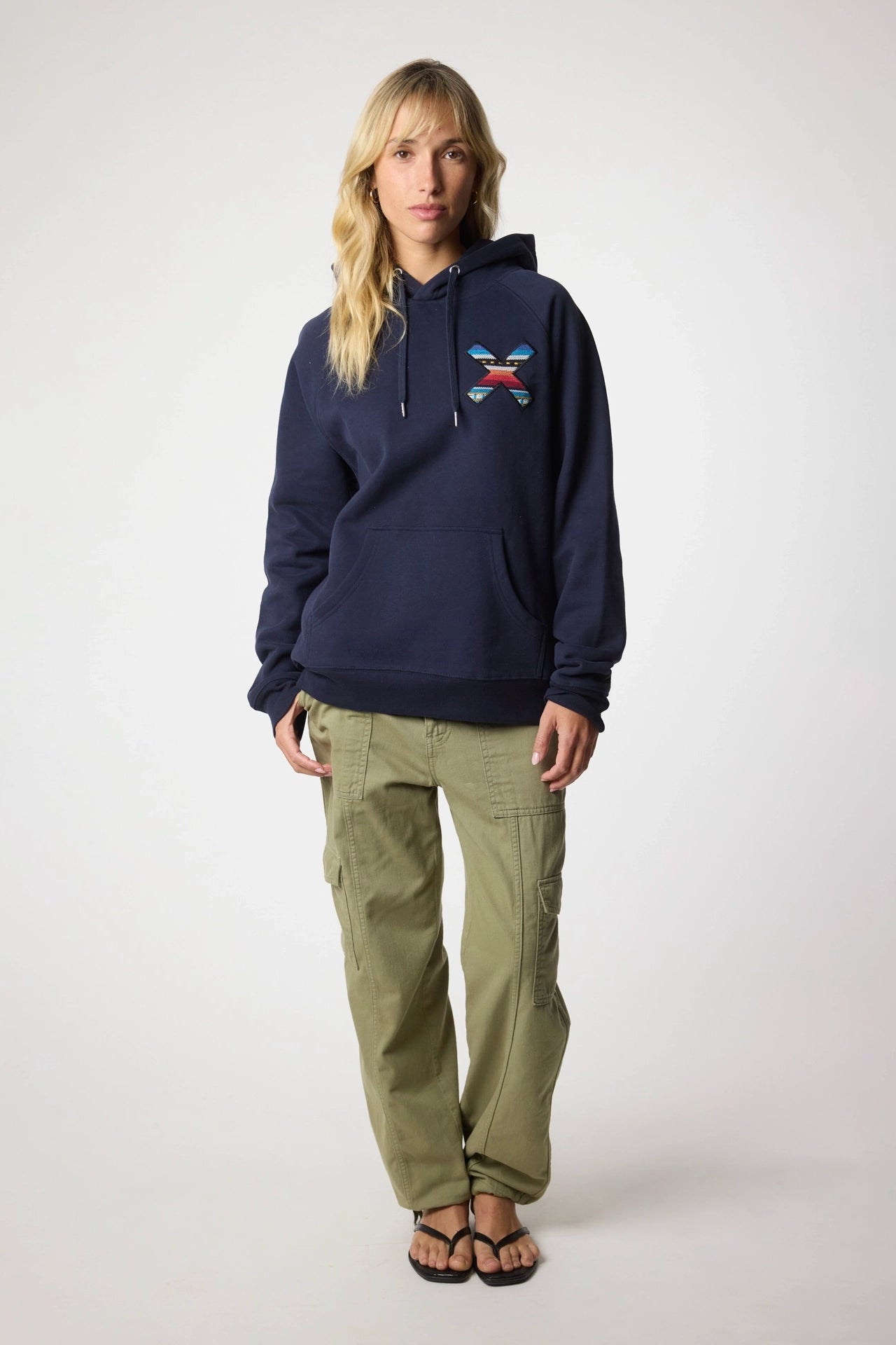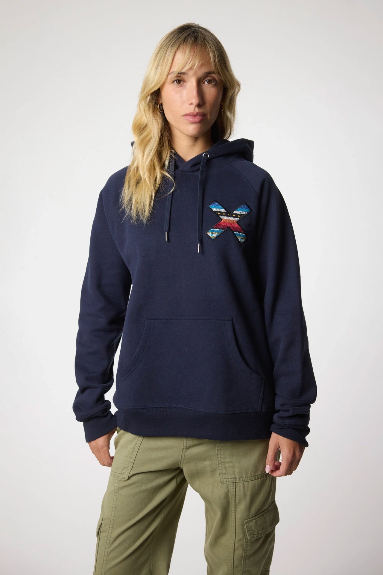 Sudadera con capucha con nuestra clásica X bordada: delantera en el pecho y trasera en la espalda. Confeccionada con 100% algodón orgánico y corte regular fit.