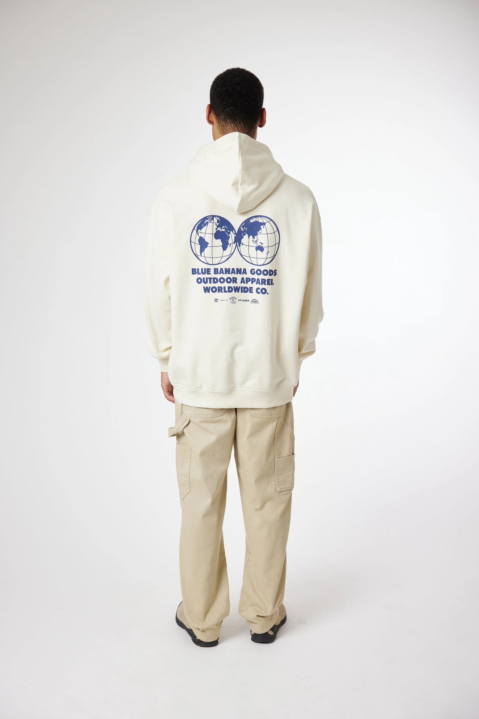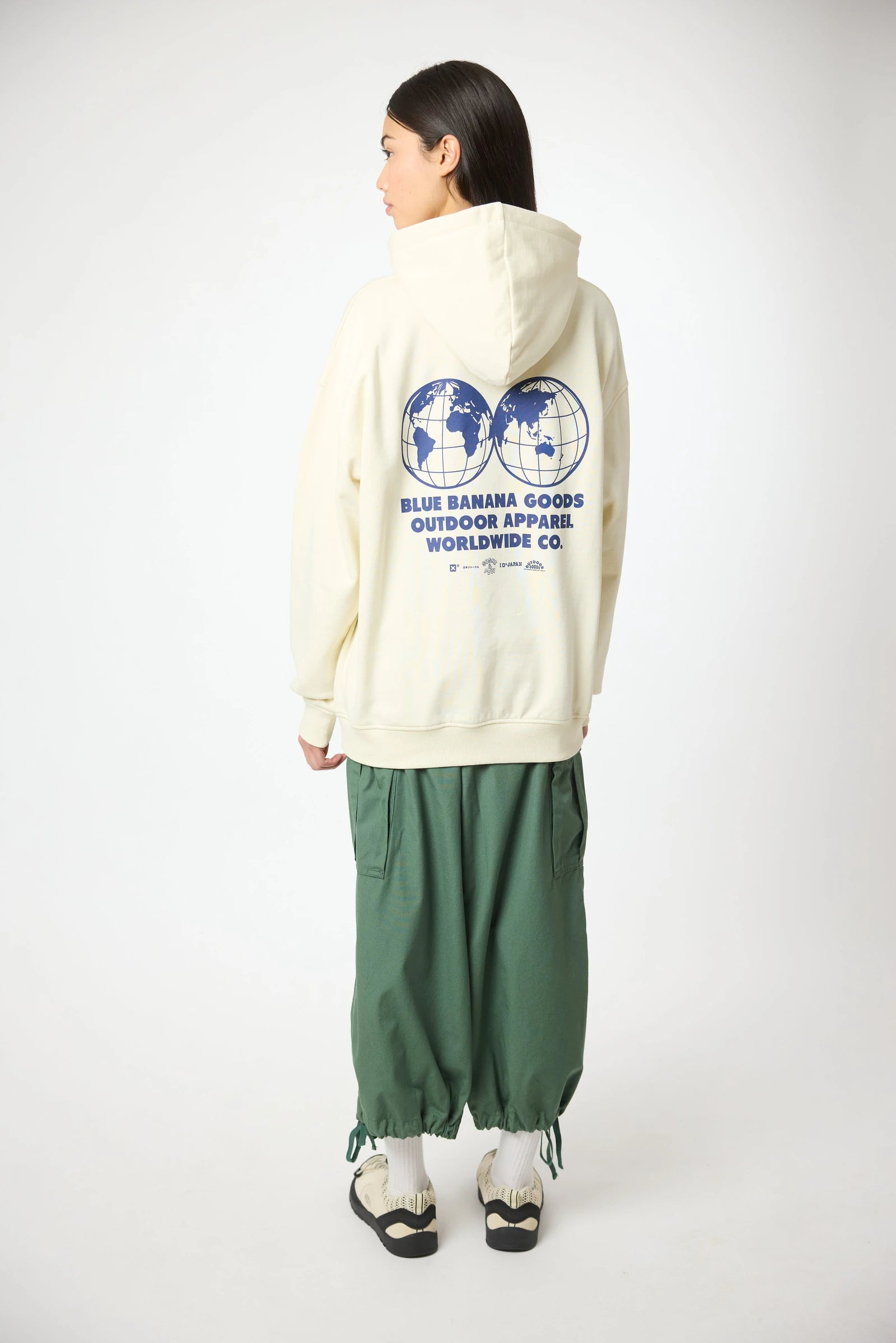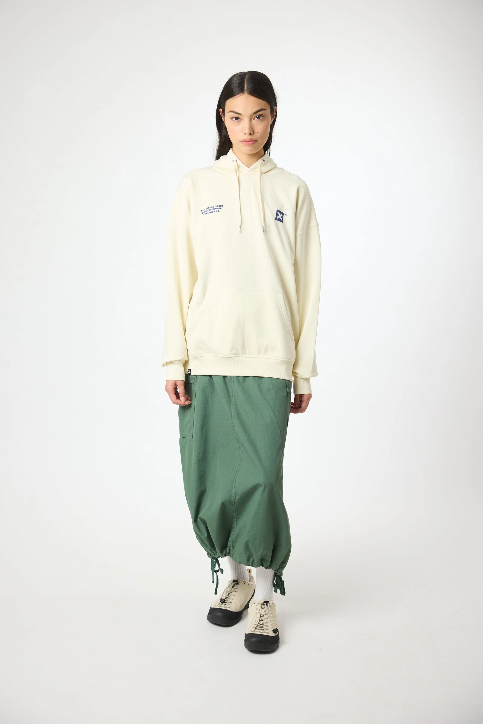 Felpa con cappuccio con stampa frontale in alto a sinistra e stampa centrale sul retro. Tasca anteriore centrale inferiore con aperture su entrambi i lati. Realizzata in 100% cotone biologico e dalla vestibilità oversize.