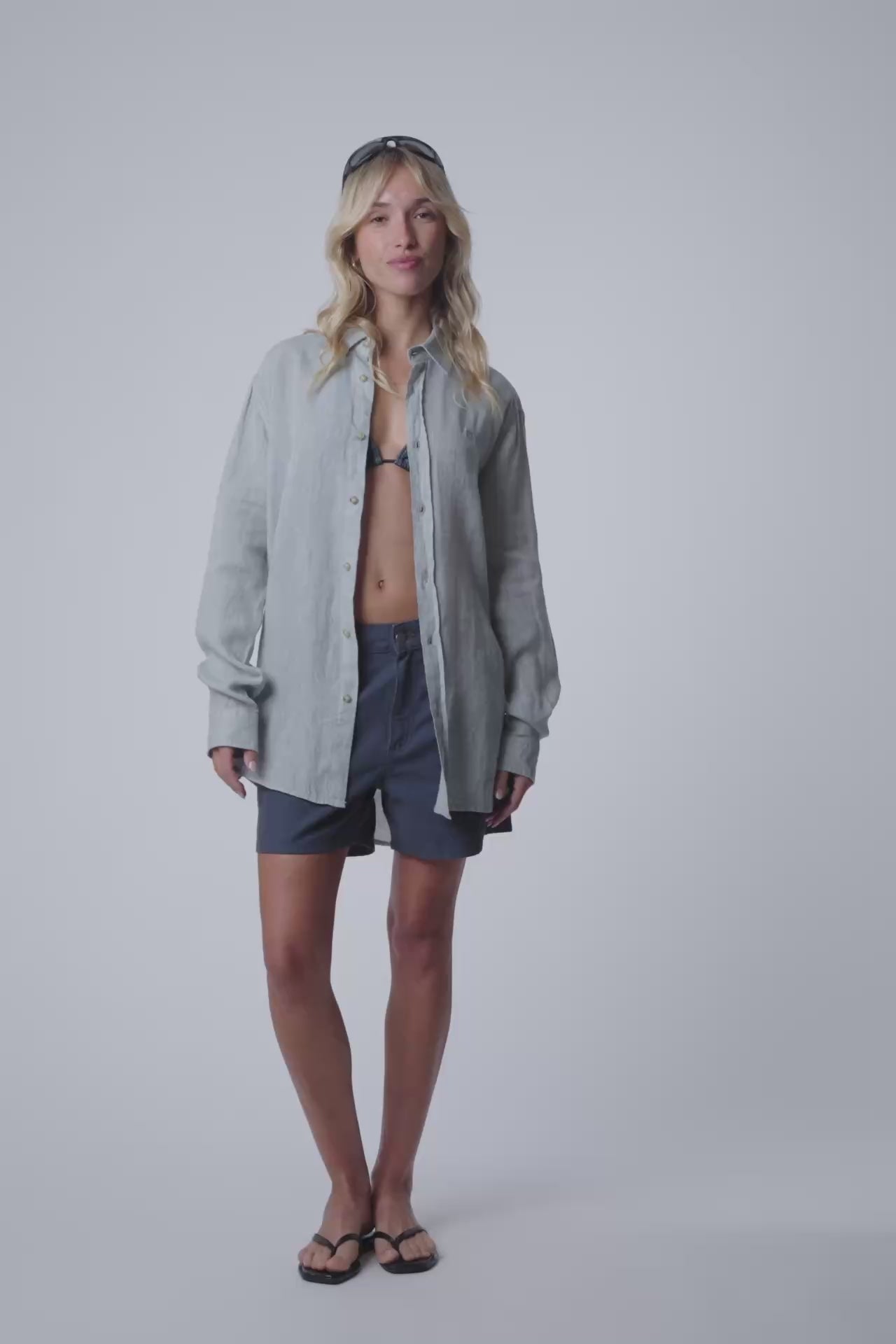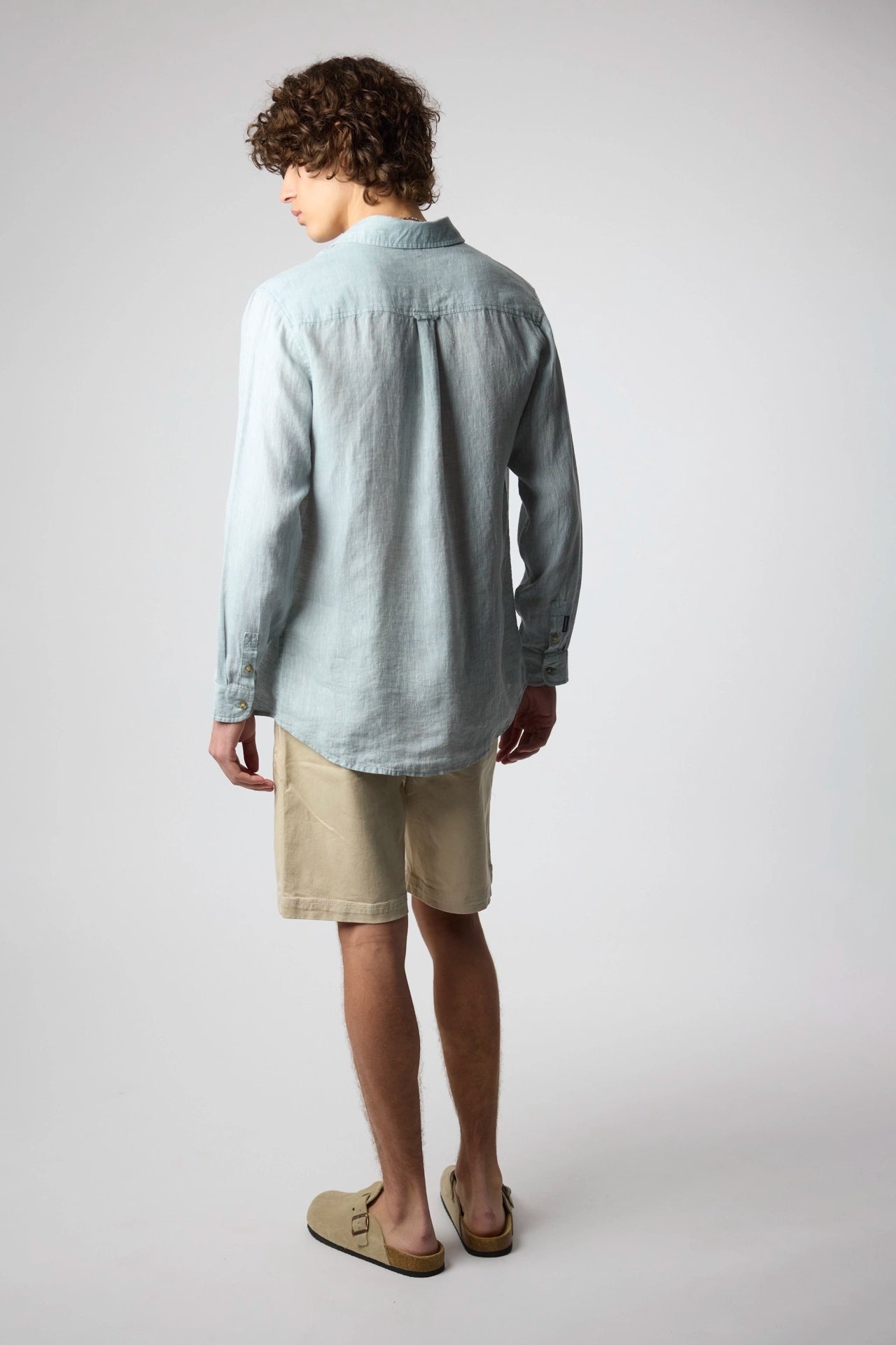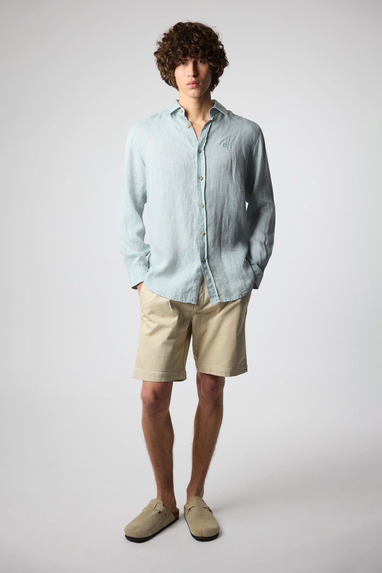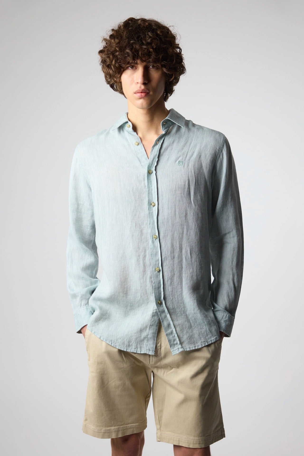 Camicia realizzata in 100% lino. Etichetta ricamata nell'angolo in basso a sinistra. Ricamo coordinato sul petto. Bottoni personalizzati.