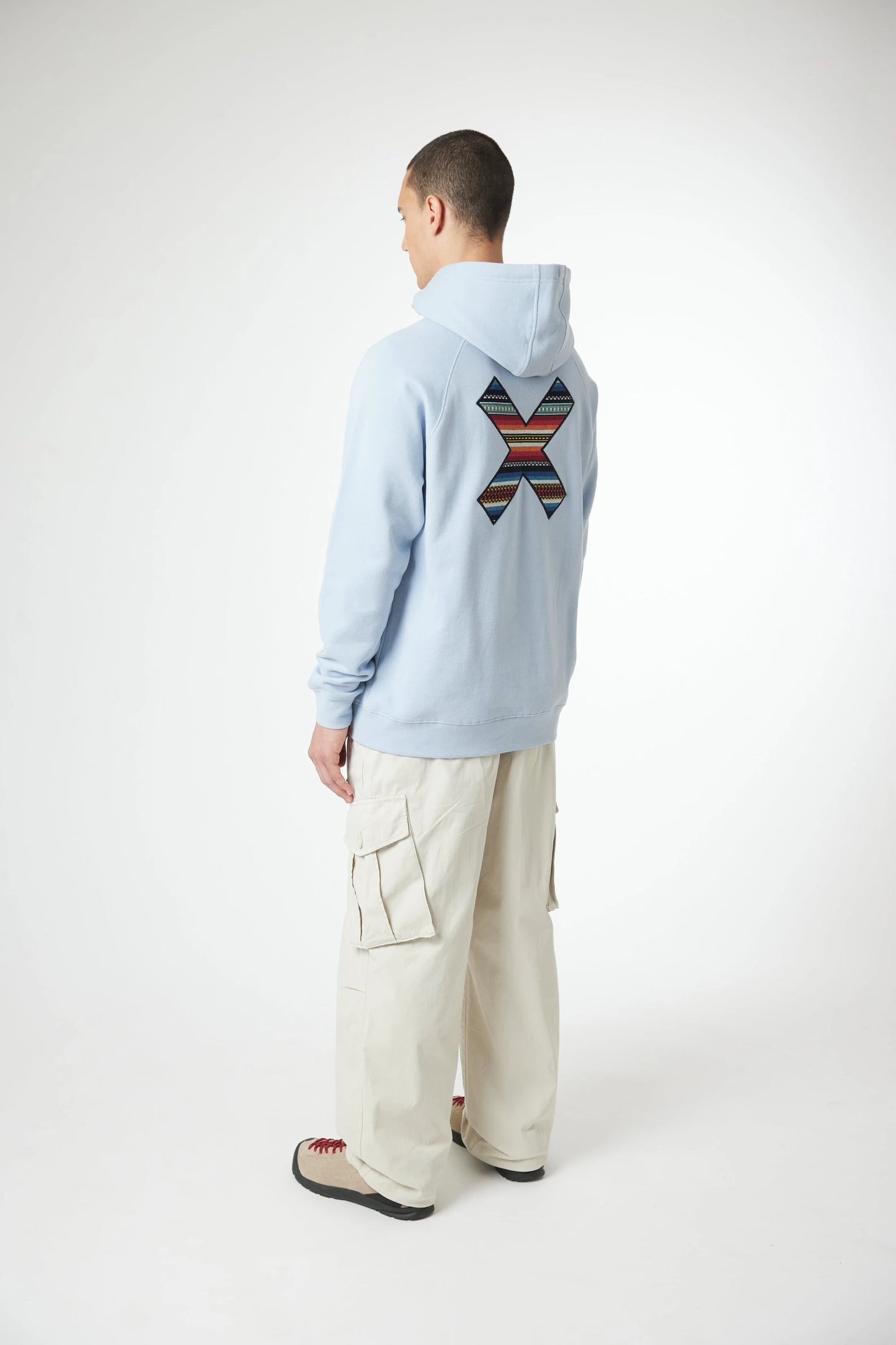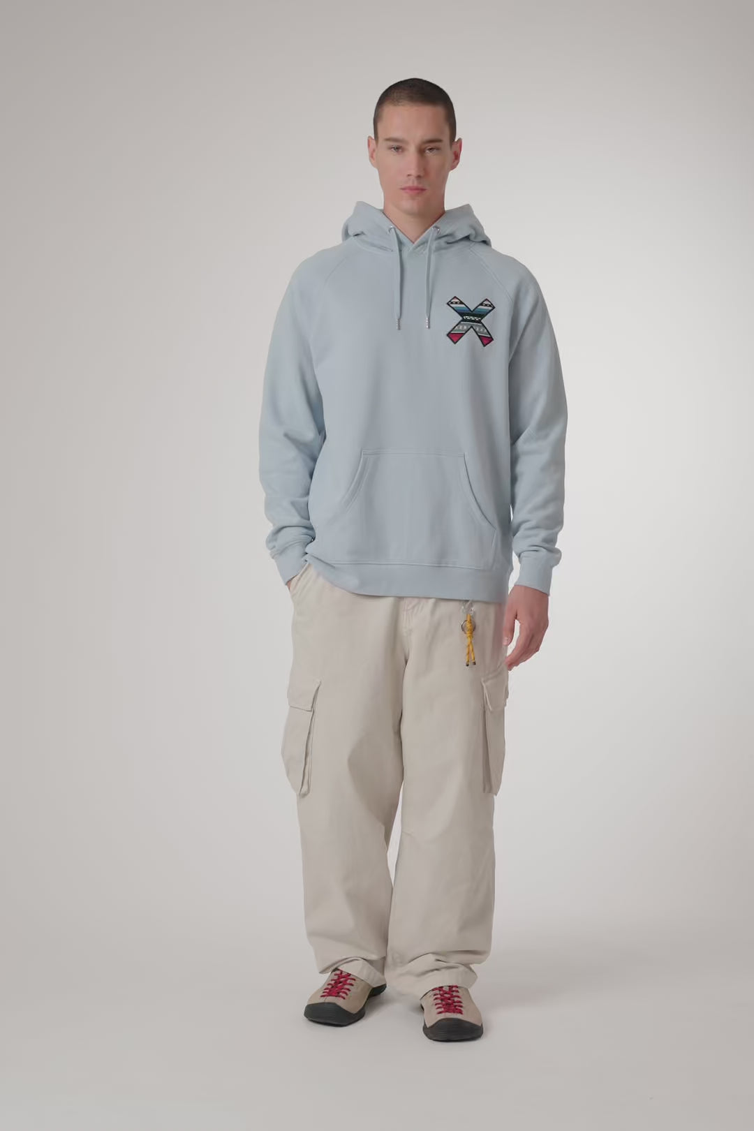 Felpa con cappuccio e la nostra classica X ricamata: sul petto e sulla schiena. Tasca centrale inferiore anteriore con apertura su entrambi i lati. Realizzata in 100% cotone biologico.