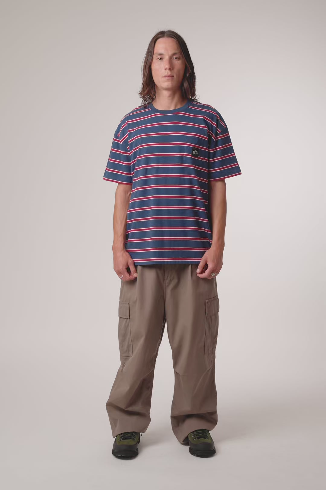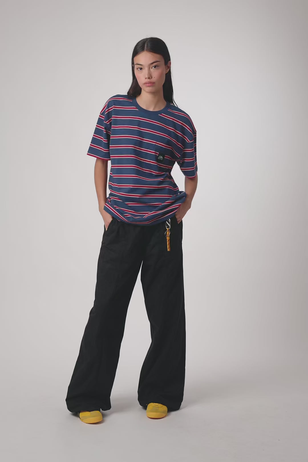 Maglietta a righe con ricamo frontale sul petto. Realizzata in 100% cotone biologico e dalla vestibilità oversize.