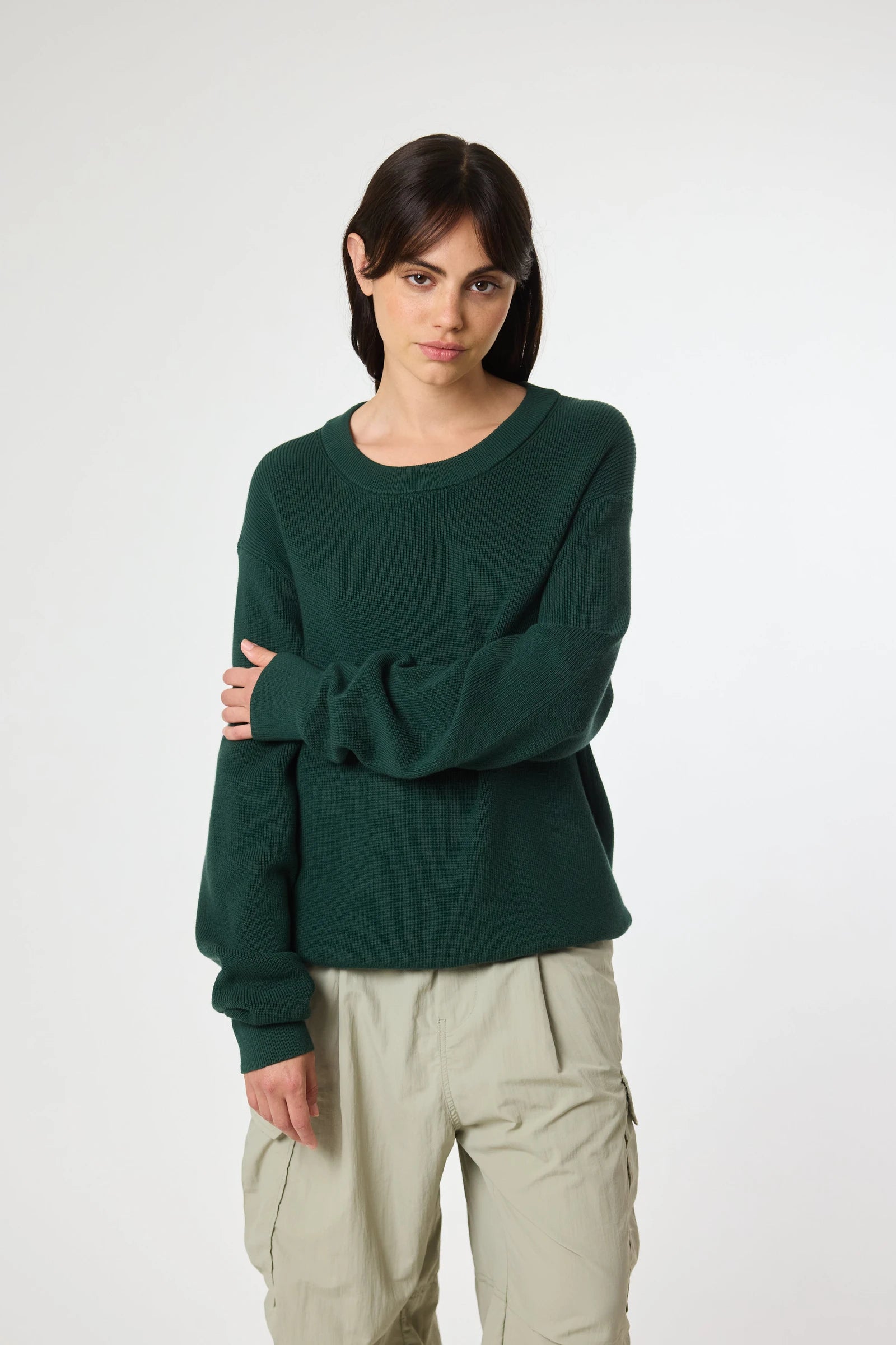 Maglione a coste, realizzato in cotone. Girocollo e finiture a costine. Con etichetta decorativa di branding sul fondo.
