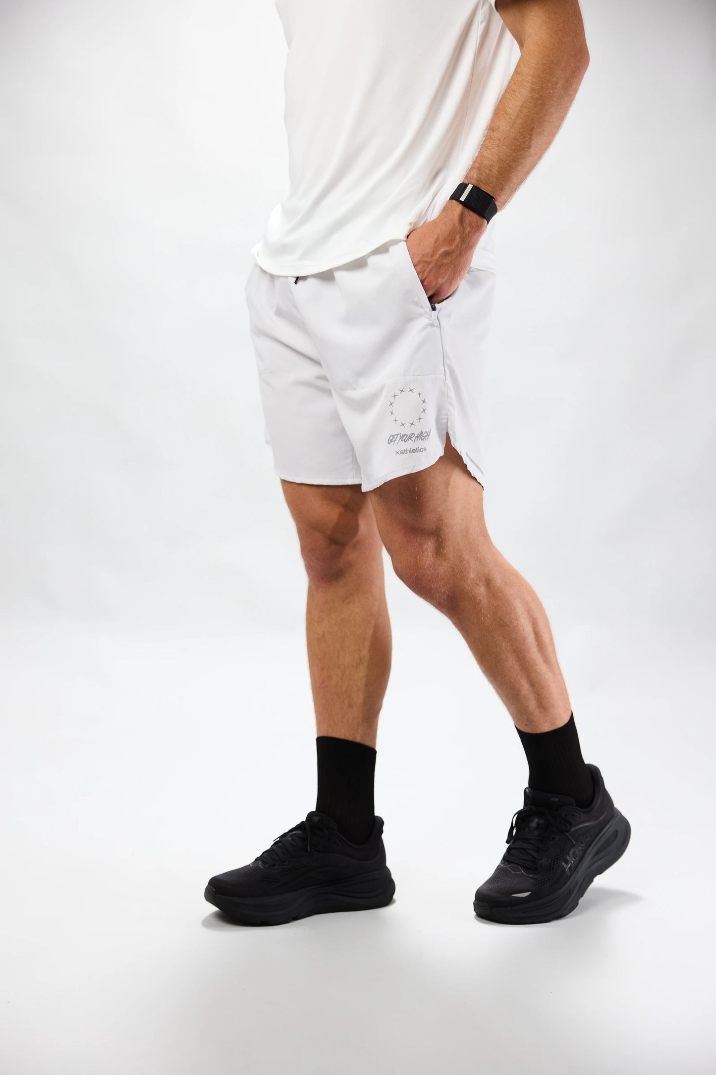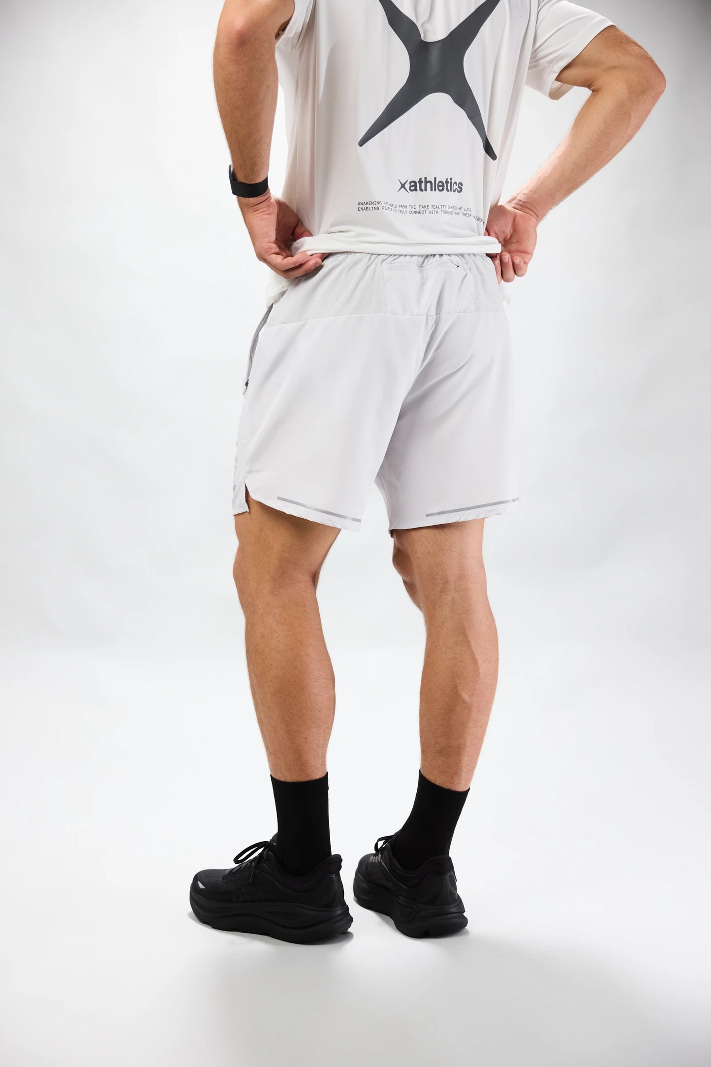Pantalón deportivo corto fabricado con poliéster 100% reciclado. Cuenta con bolsillos delanteros laterales con cierre en cremallera. Logo reflectante en la parte inferior izquierda y en la parte trasera inferior derecha. Apertura de 3cm en la parte lateral inferior y cordón ajustable de cierre en la cintura. En la parte trasera tiene un bolsillo superior centrado.