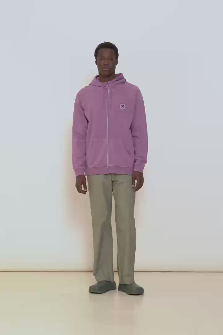 Sudadera efecto lavado con capucha con cremallera central. Logo en etiqueta tejida. Confeccionada con 100% algodón orgánico. Corte regular fit y gramaje: 400 GSM.