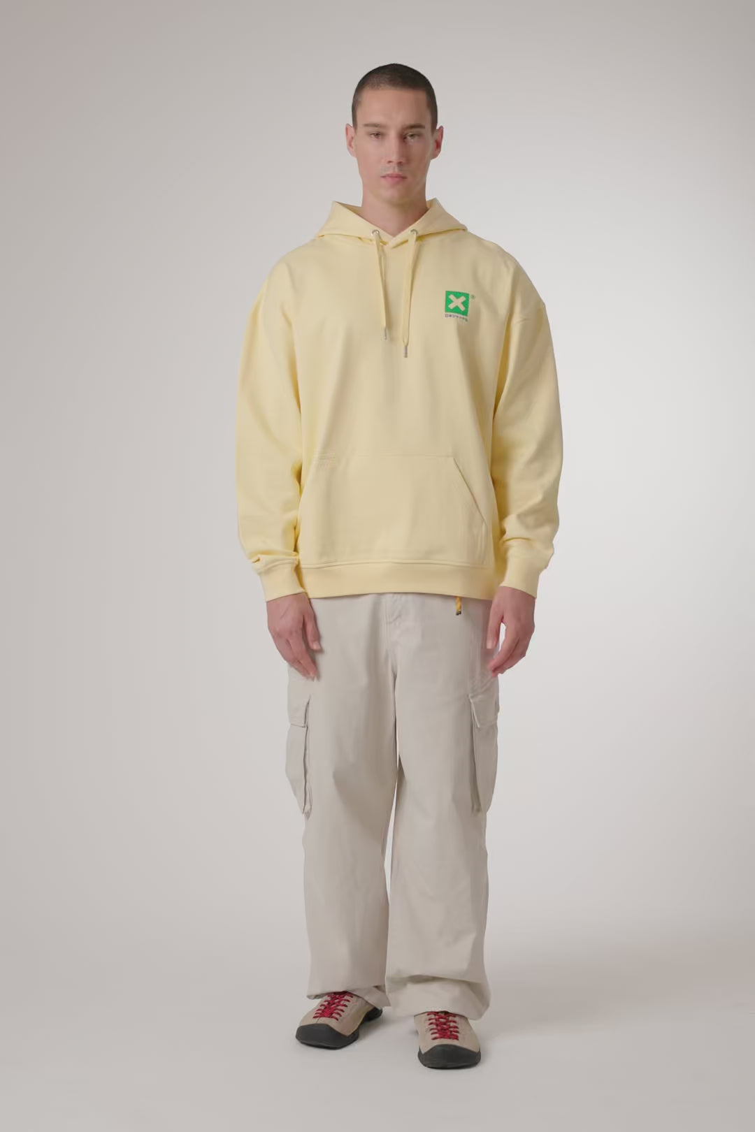 Felpa con cappuccio con stampa frontale in alto a sinistra e stampa centrale sul retro. Tasca anteriore centrale inferiore con aperture su entrambi i lati. Realizzata in 100% cotone biologico e vestibilità regolare.