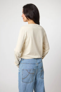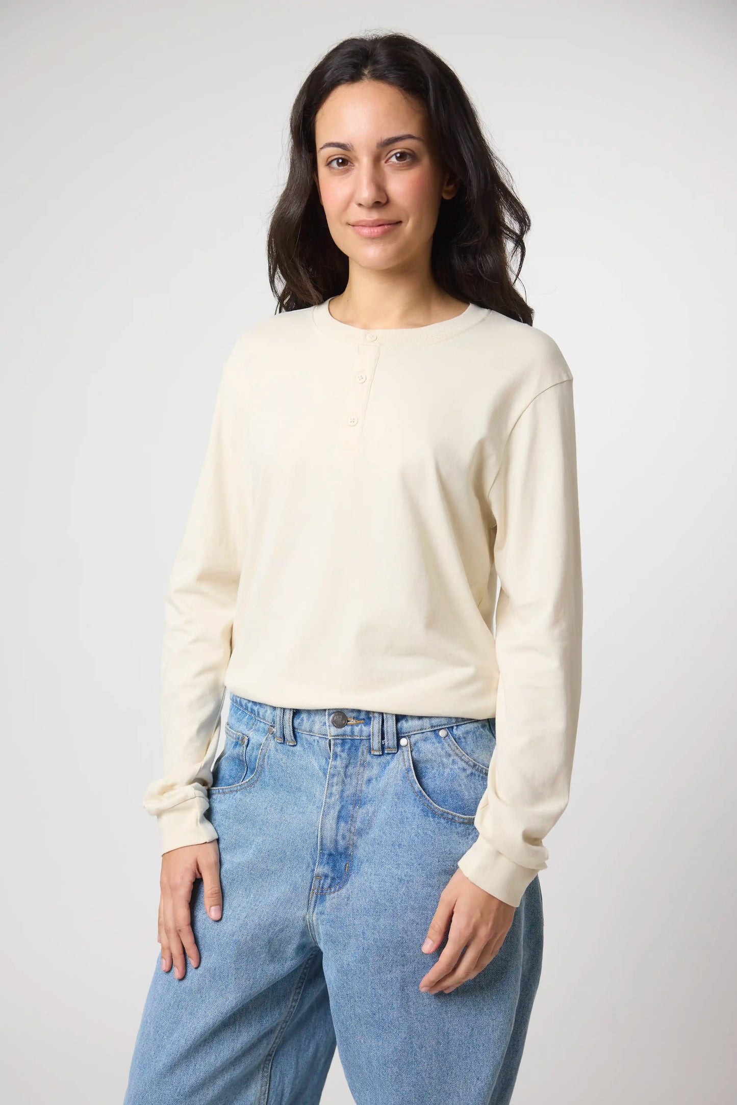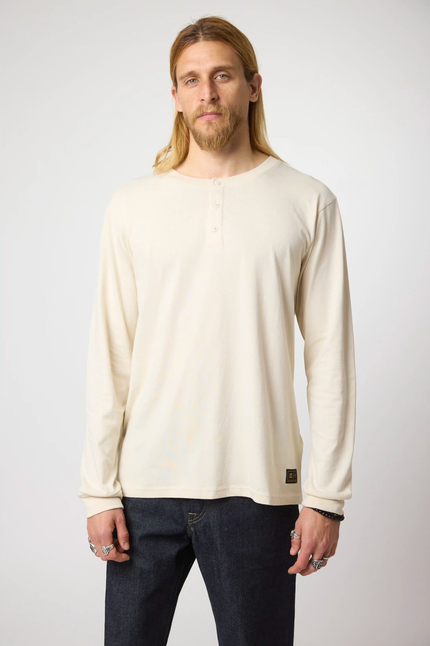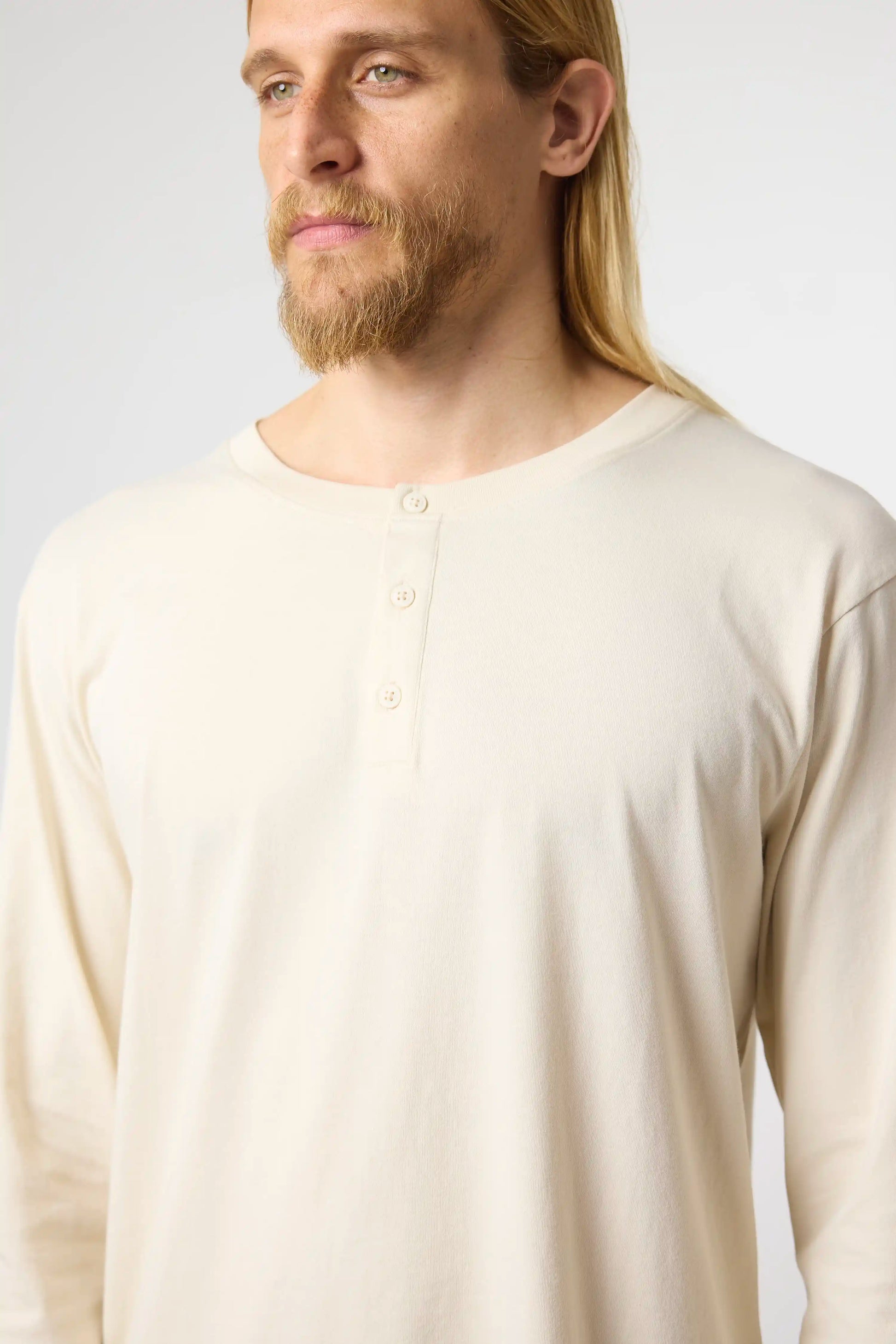 Camiseta de manga larga con cuello henley, codos reforzados y etiqueta bordada de algodón 100% orgánico.