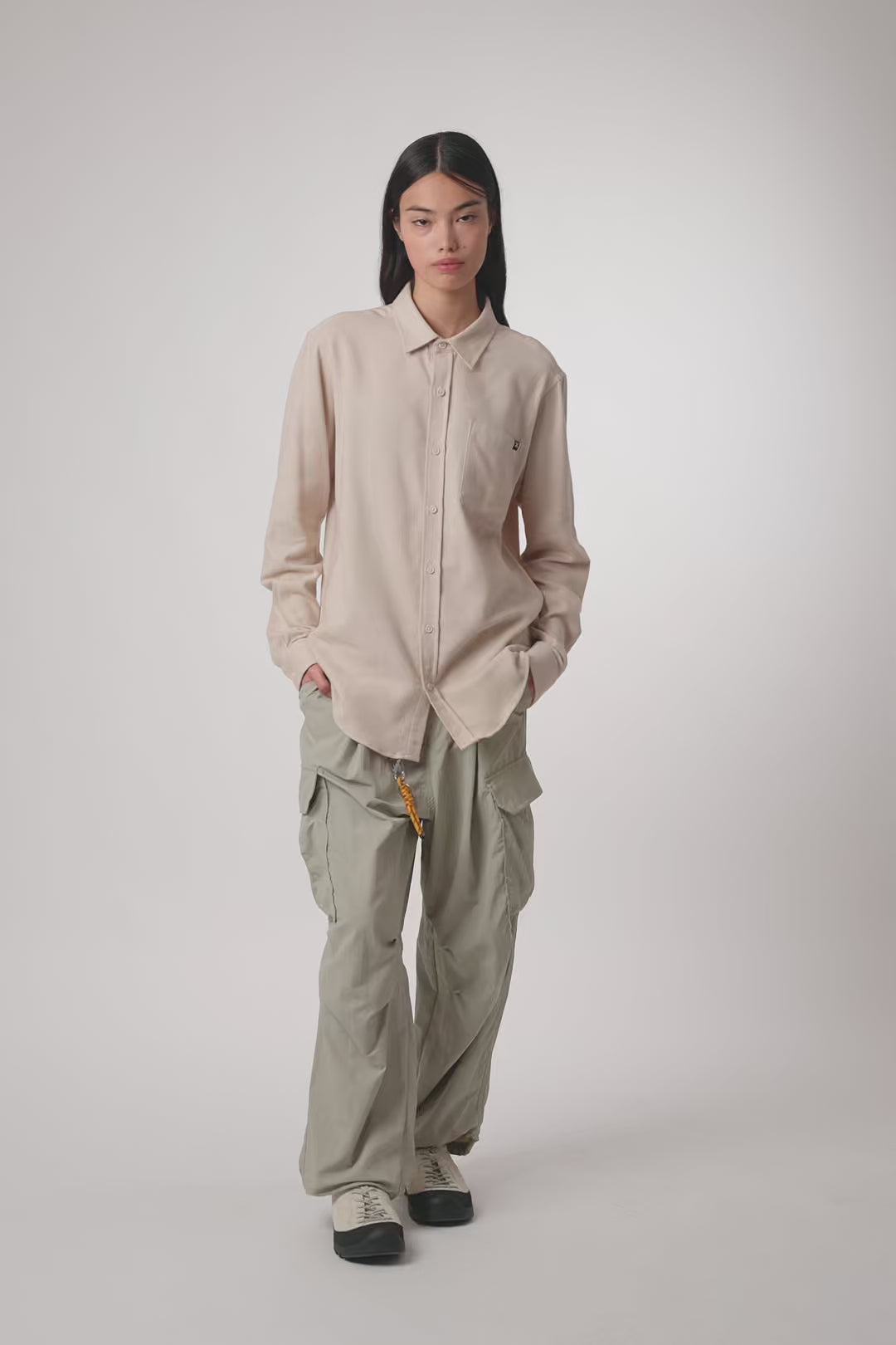 Camicia a maniche lunghe, 100% cotone. Una tasca applicata sul petto. Spalla avanzata. Bottoni personalizzati. Etichette di branding sulla tasca anteriore e sulla cucitura laterale.