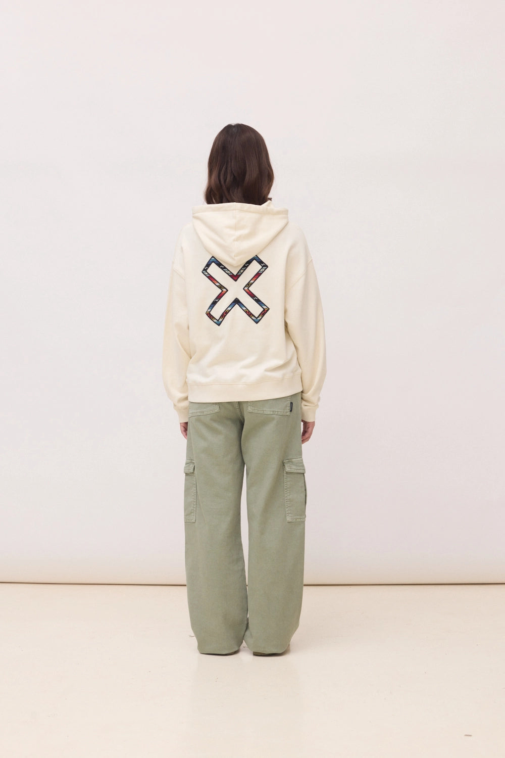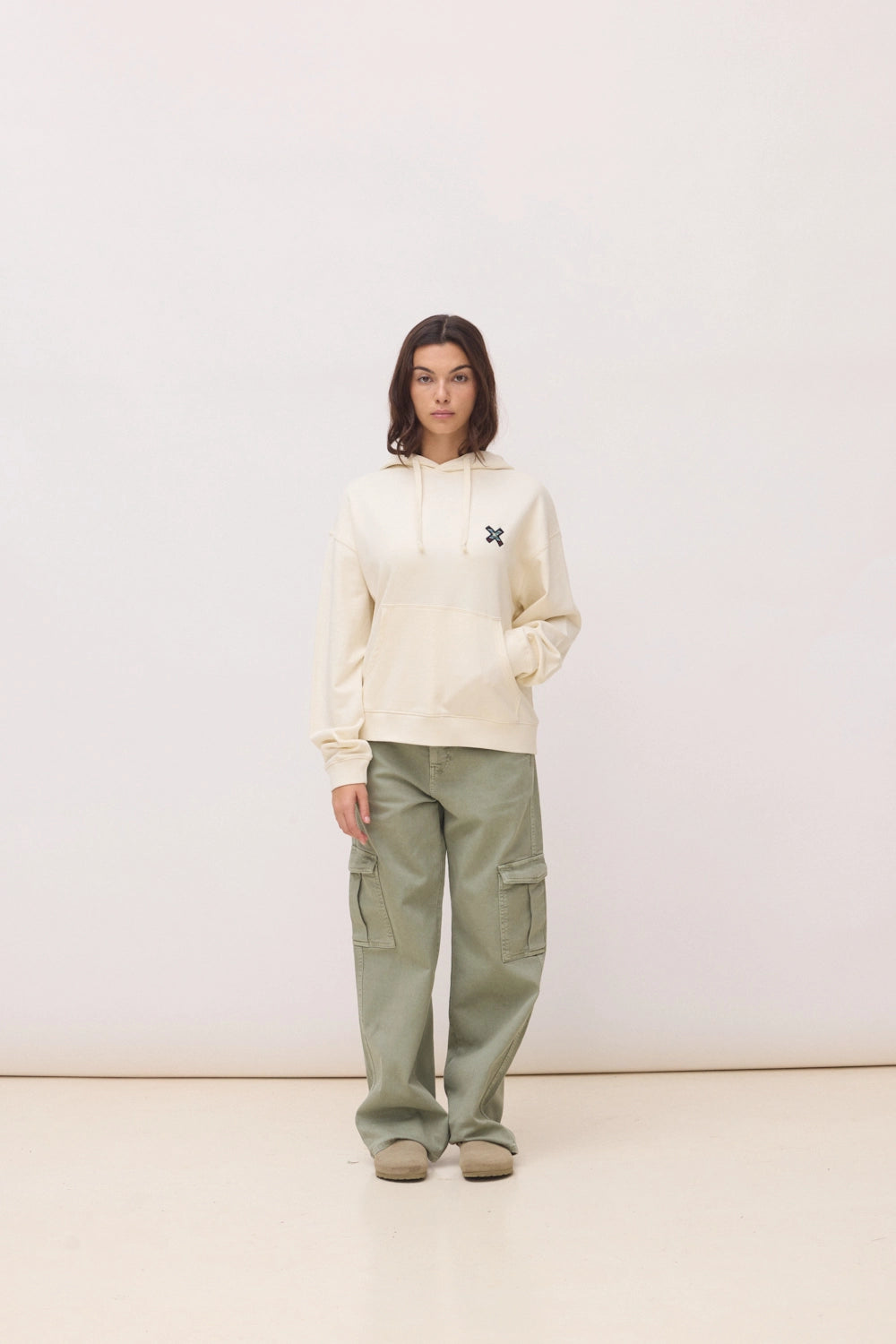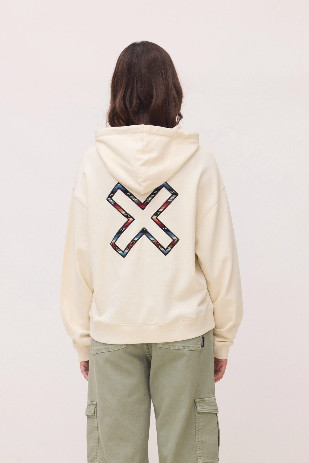 Felpa con cappuccio con la nostra classica X sul petto e sulla schiena. Tasca frontale centrale inferiore con apertura su entrambi i lati. Confezionata con 100% cotone organico.