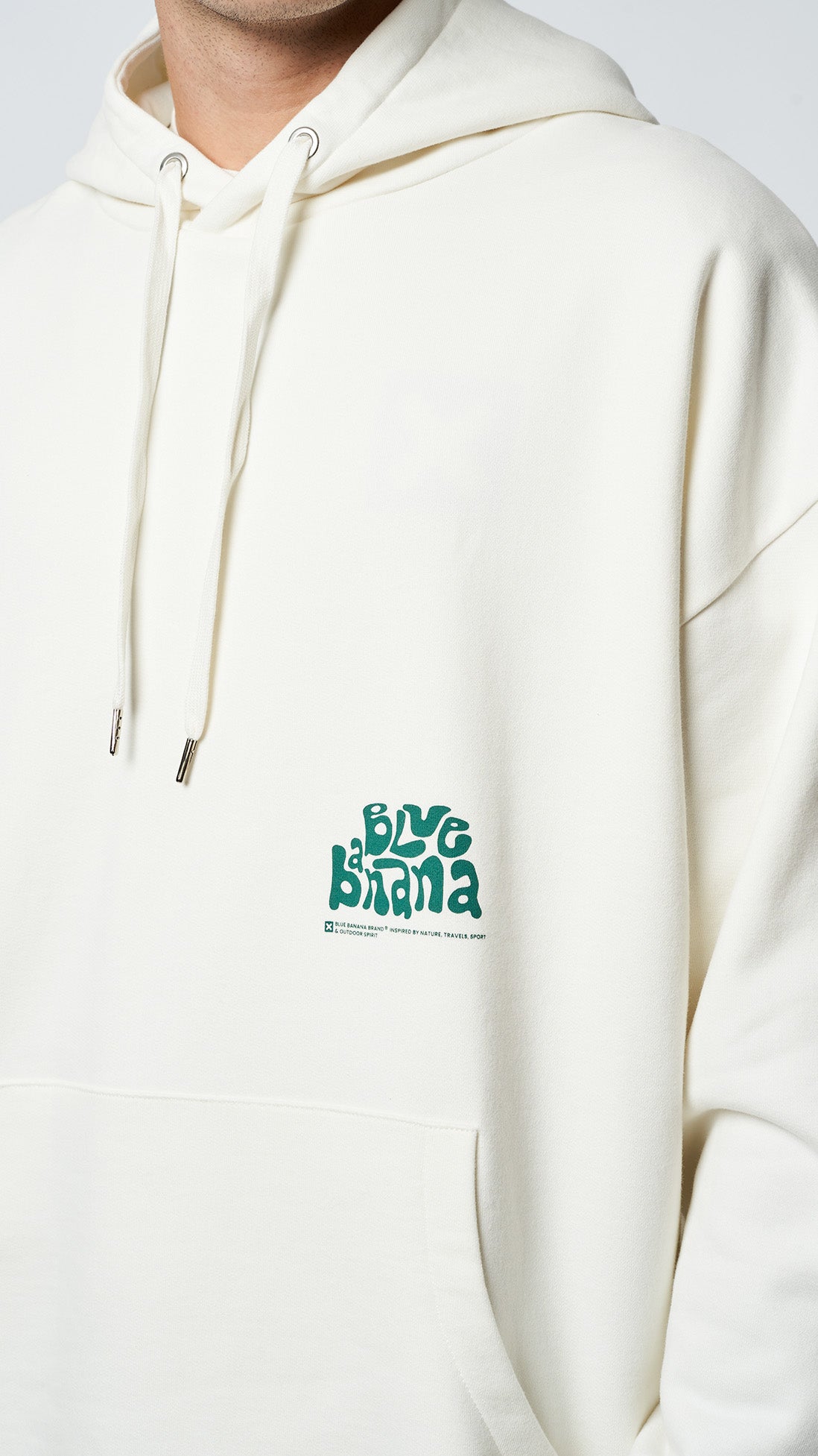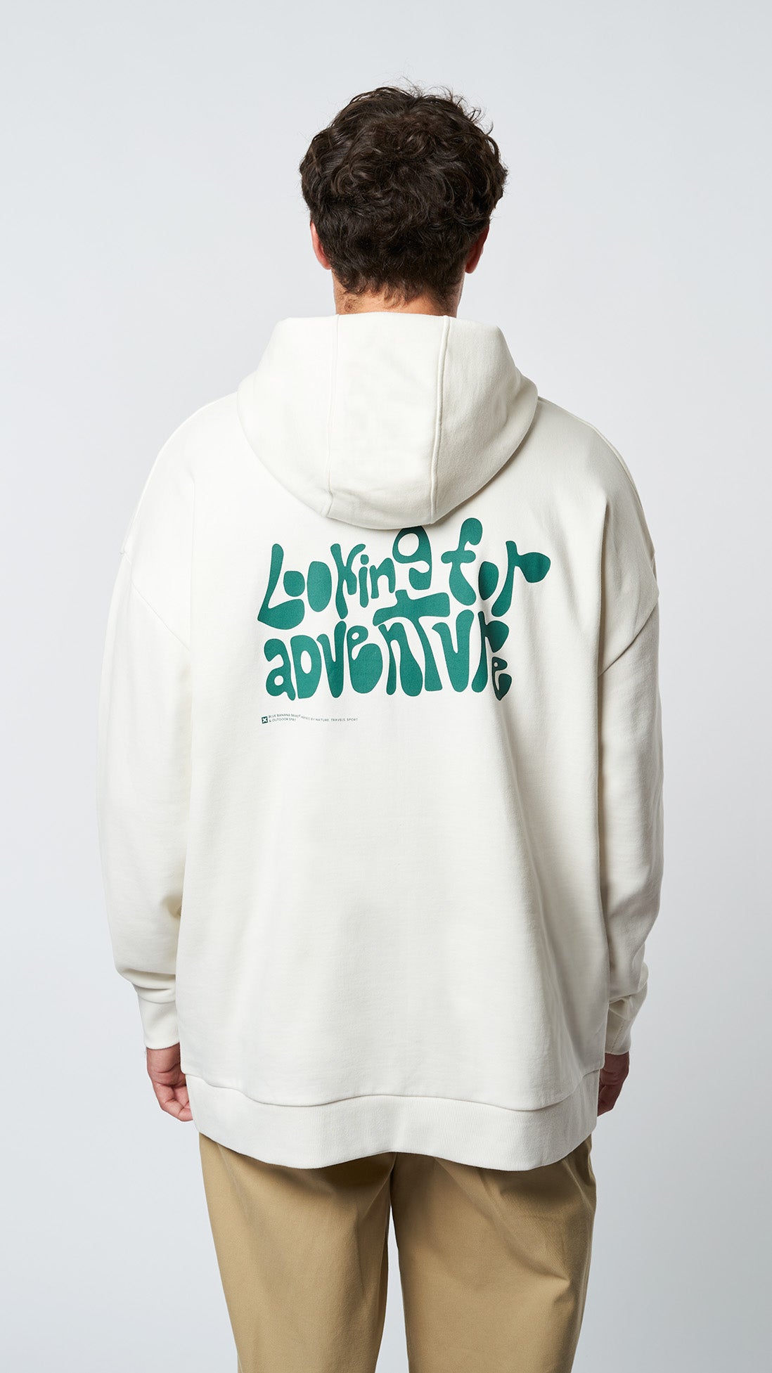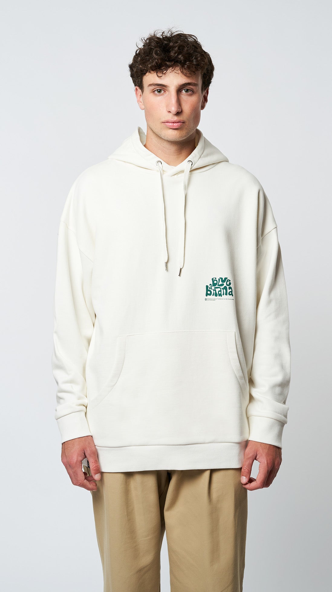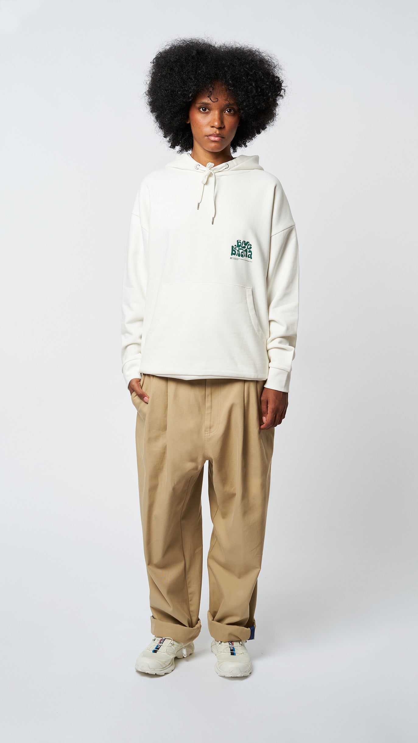 Felpa con cappuccio con stampa frontale in alto a sinistra e stampa centrale sul retro. Tasca anteriore centrale inferiore con spacchi su entrambi i lati. Realizzata in 100% cotone biologico e dalla vestibilità oversize.