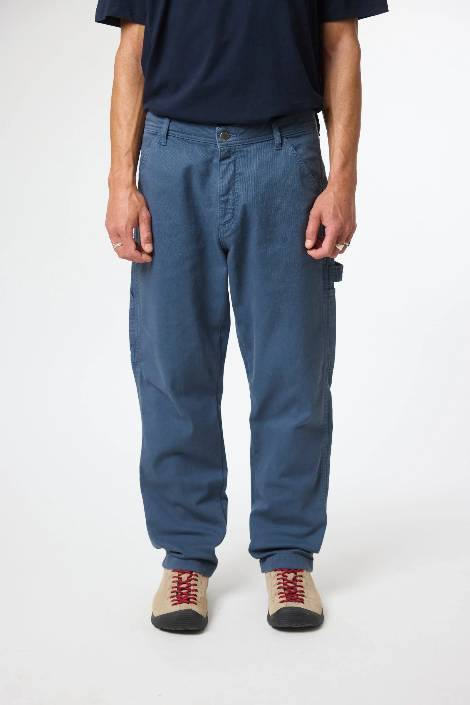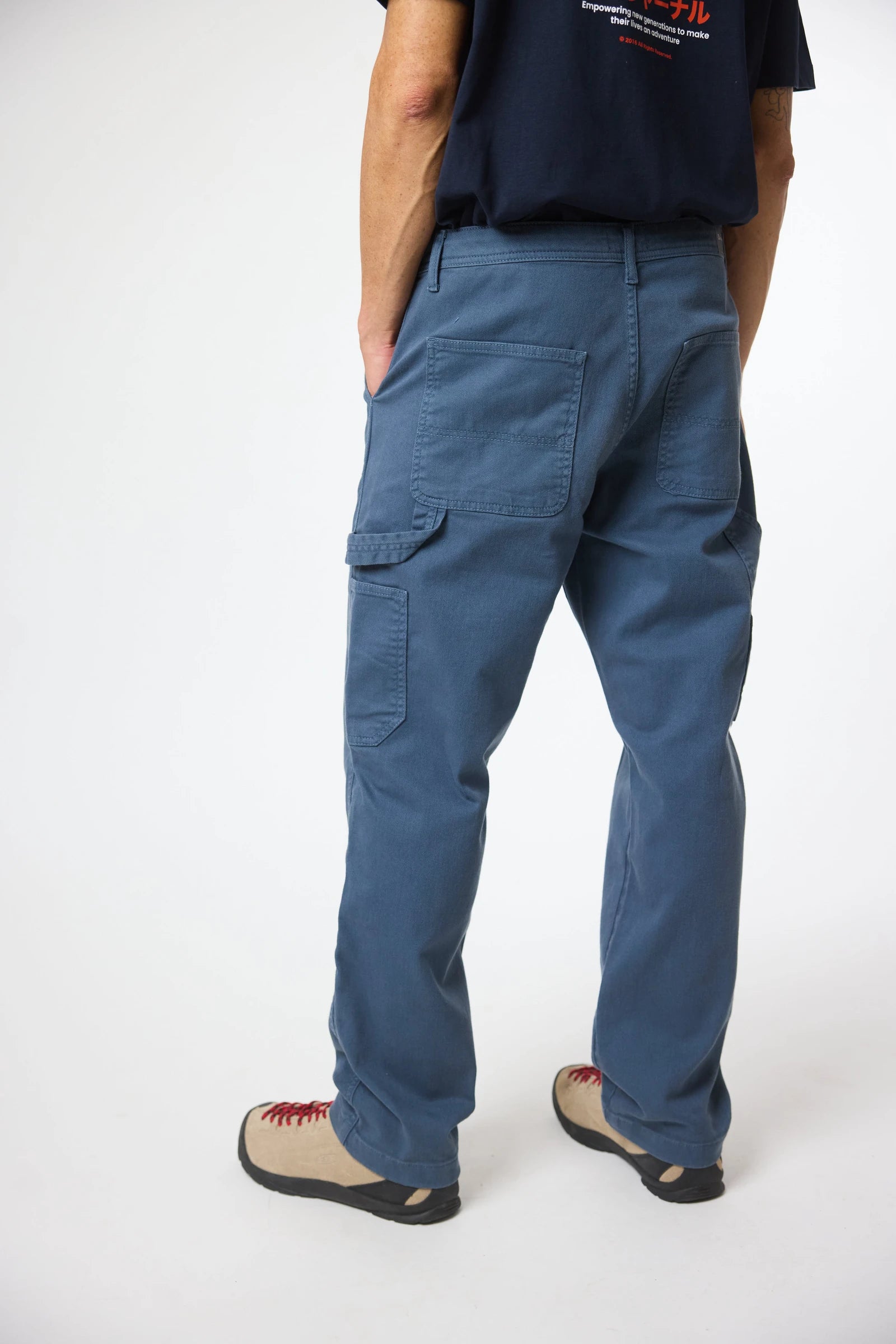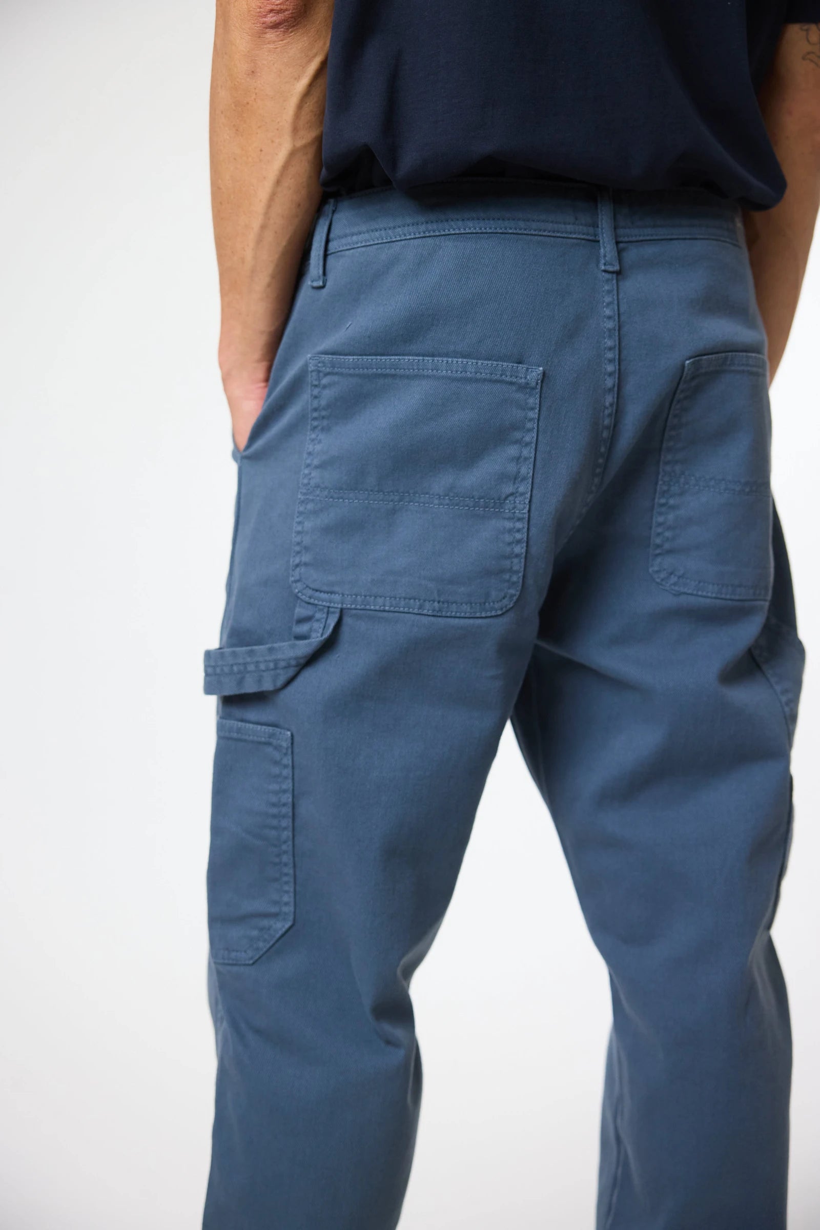 Pantaloni chino realizzati in tessuto twill, 98% cotone organico e 2% elastan. Vestibilità regular. Chiusura con zip e bottone personalizzato. Tasche frontali e tasche posteriori stile “carpenter”. Con etichetta di branding sulla tasca posteriore e back tab decorativo in vita. Con passanti per cintura.