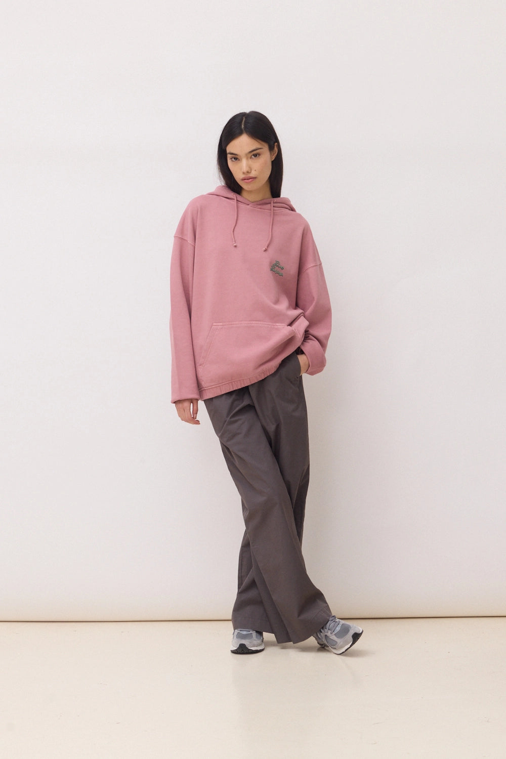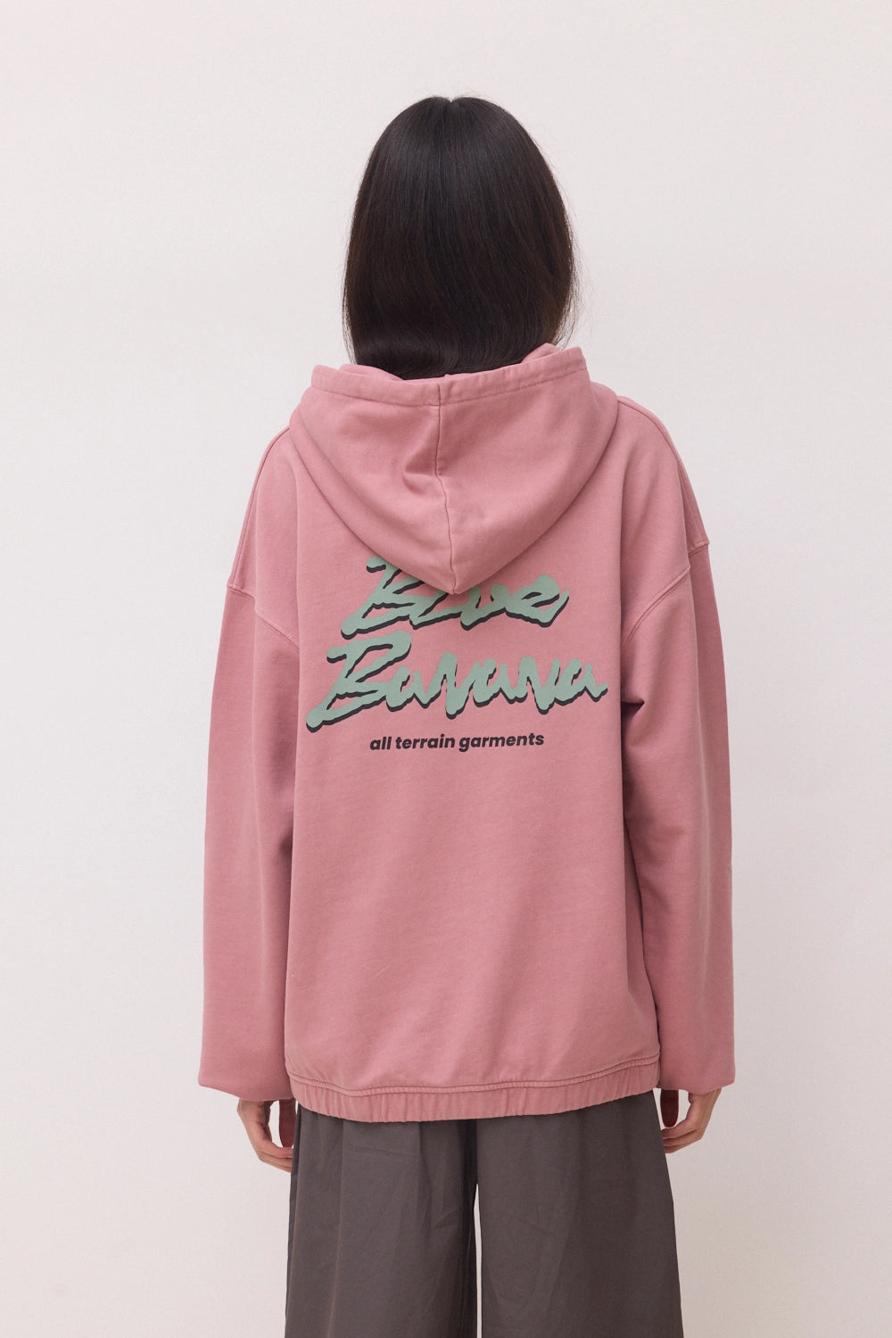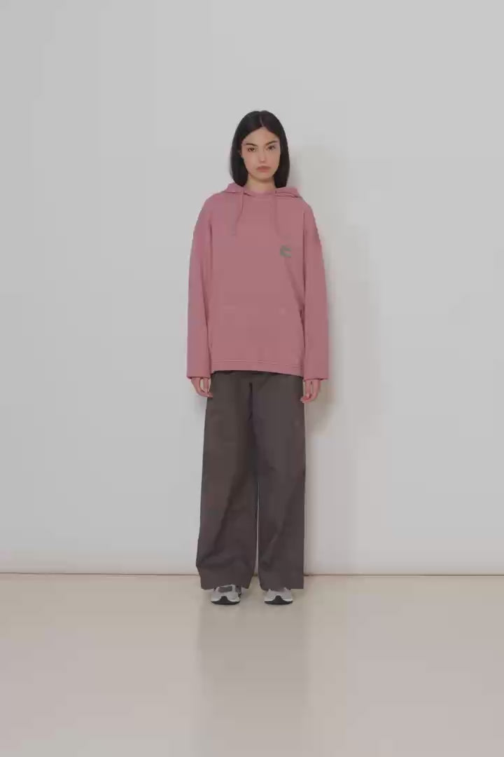 Felpa con cappuccio con stampa frontale sul lato superiore sinistro e stampa centrale sul retro e taglio oversize. Confezionata con 100% cotone organico.