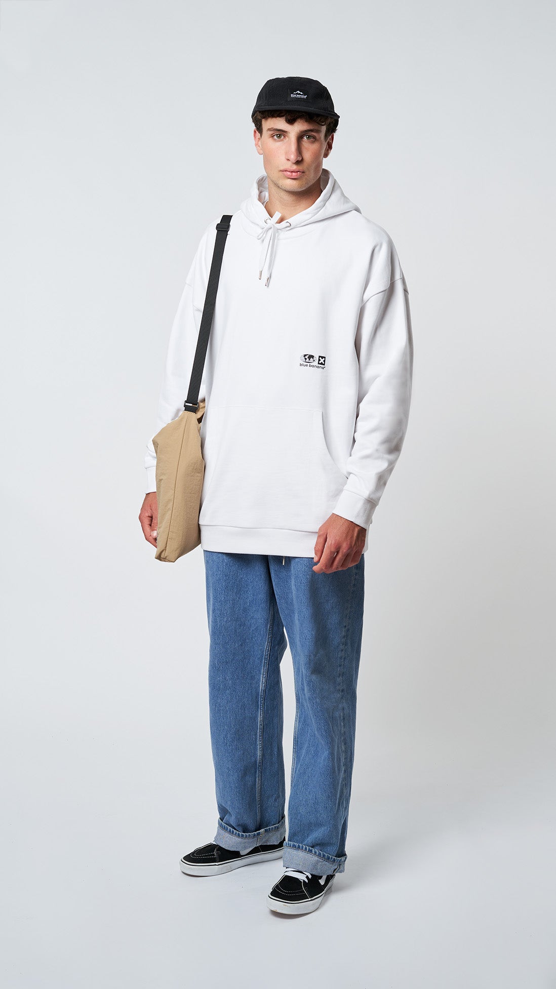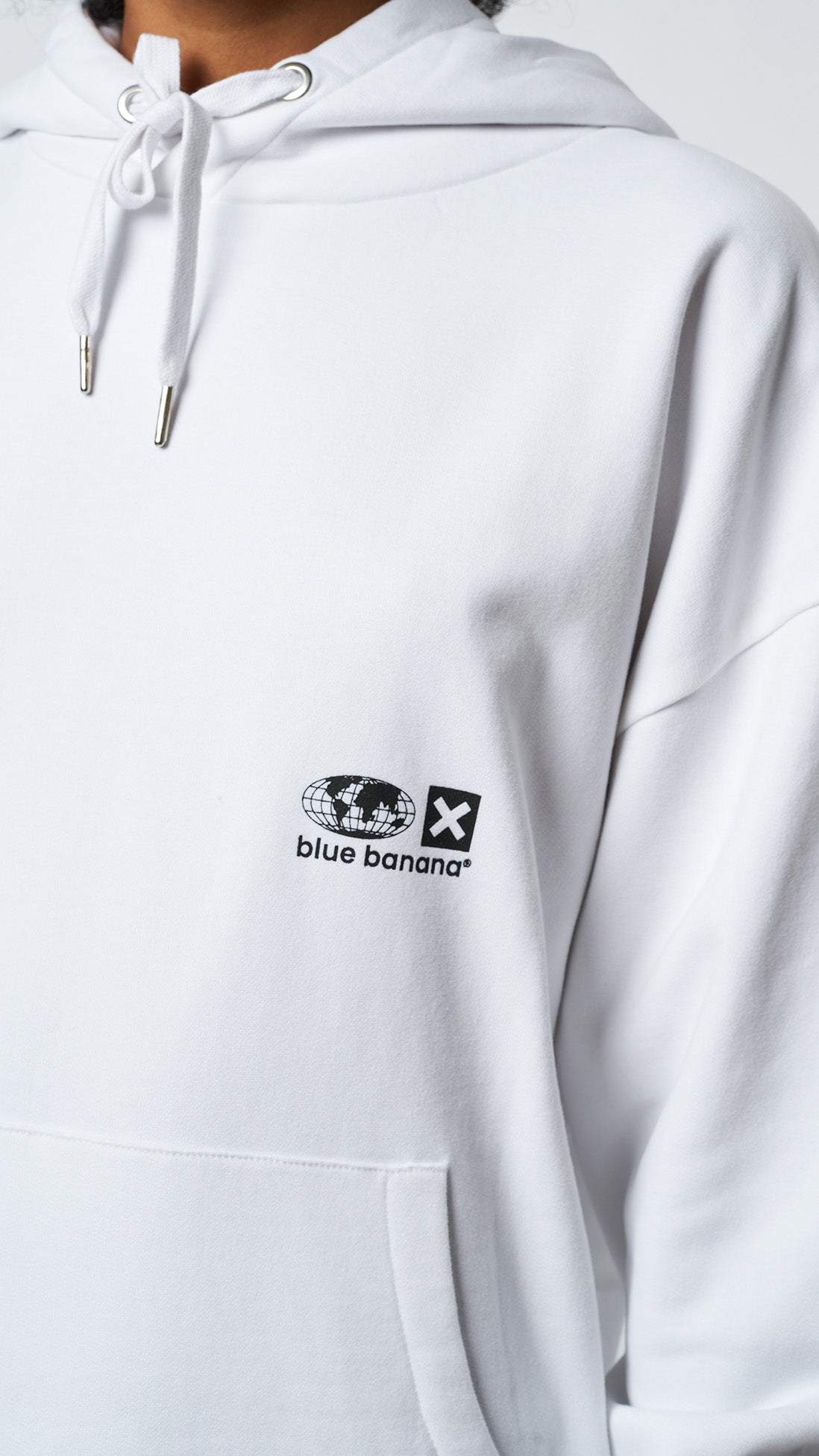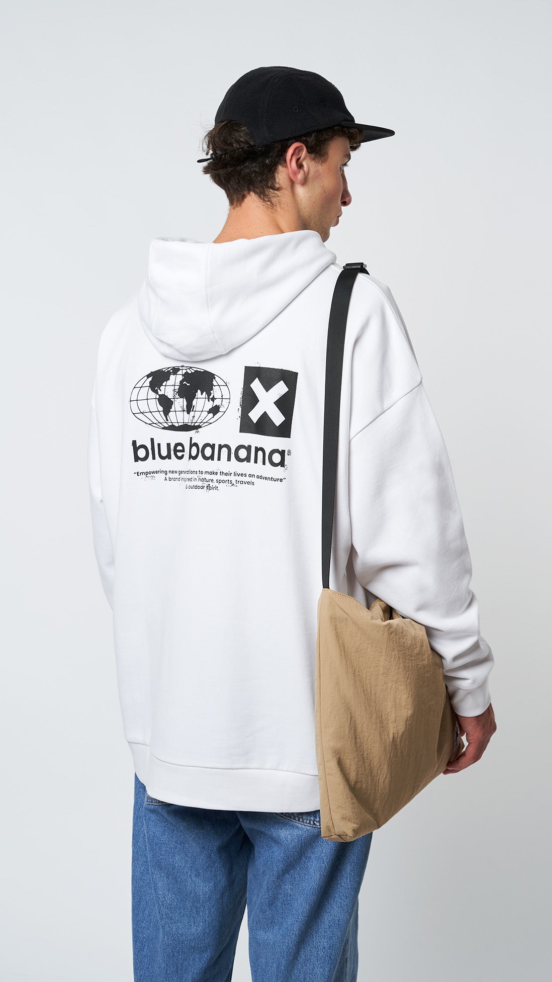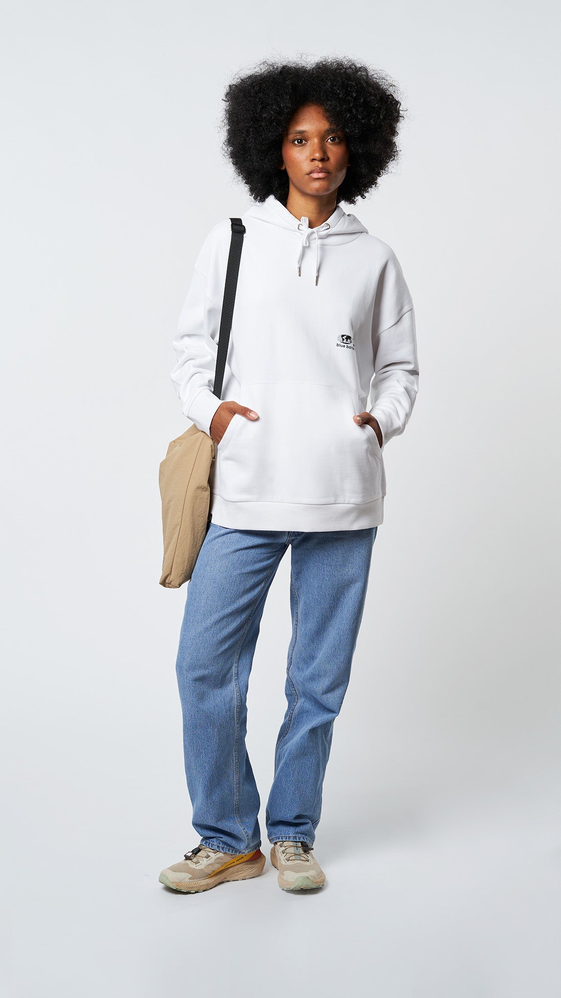 Felpa con cappuccio con stampa frontale in alto a sinistra e stampa centrale sul retro. Tasca anteriore centrale inferiore con aperture su entrambi i lati. Realizzata in 100% cotone biologico e vestibilità oversize.